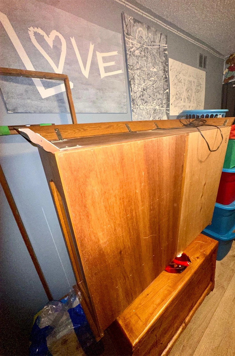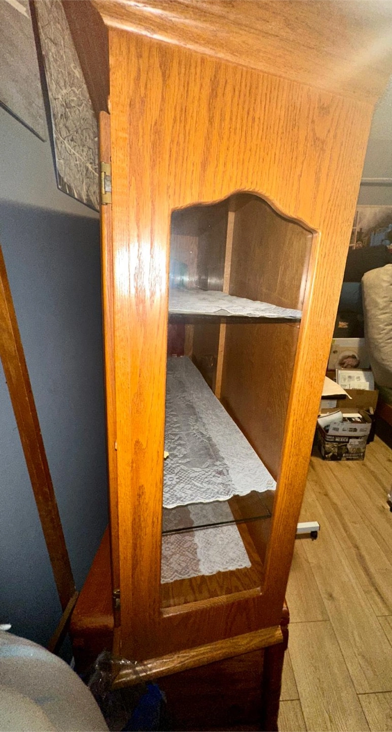 Selling a glass and wooden China cabinet top with glass shelves. It's in good condition and perfect for displaying your favourite items. It has a classic design that would fit well in any home