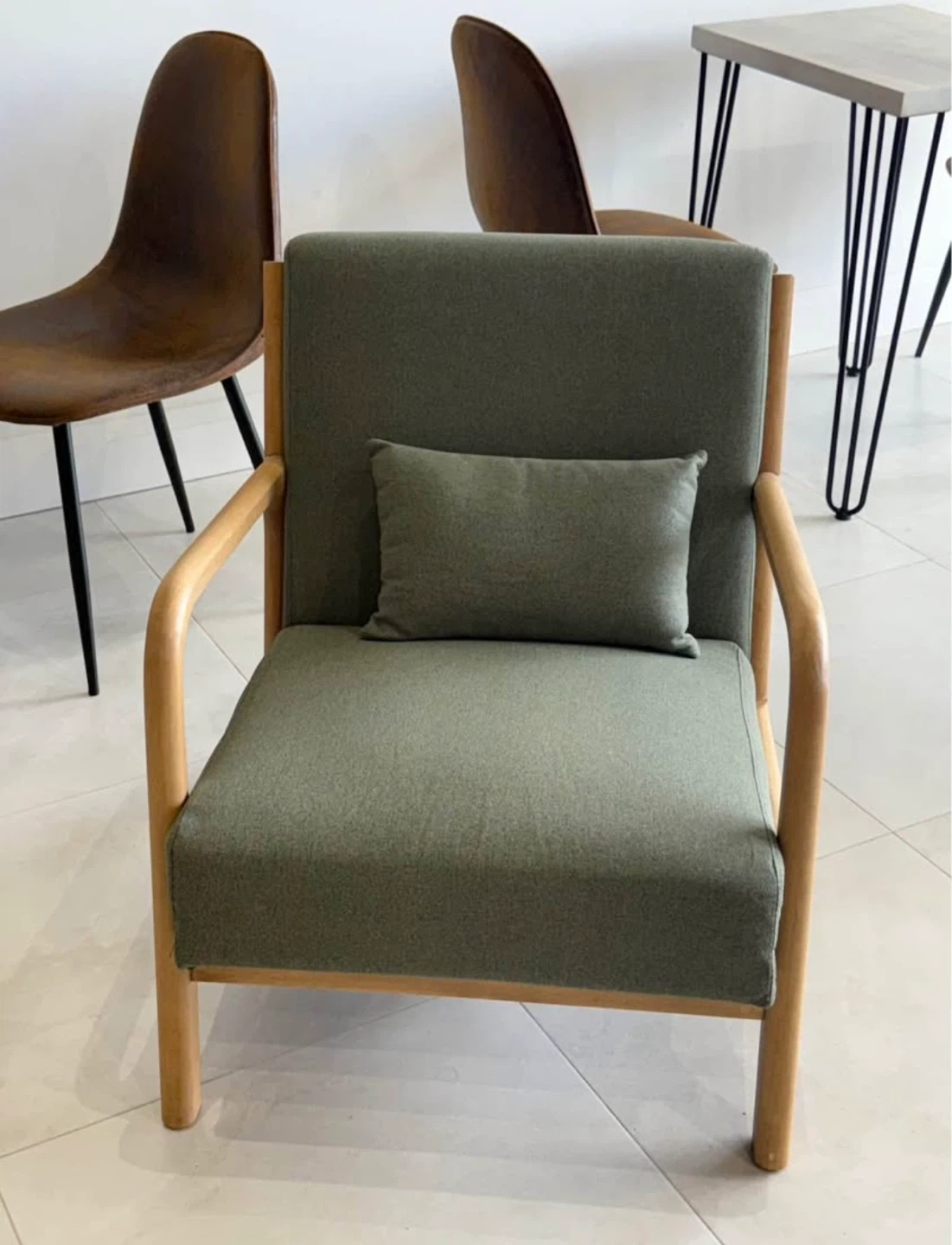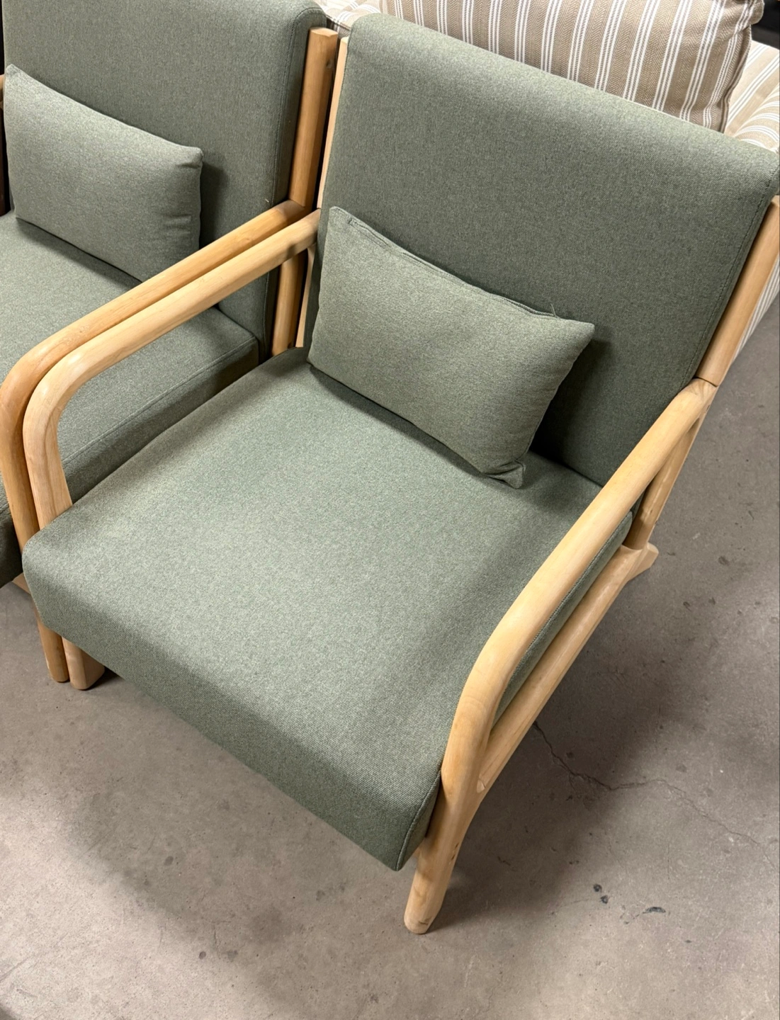 Selling a comfy armchairs with a light green fabric and a wooden frame. It's new never been used and would look lovely in any living room or study. Comes with one pillow only. 1 chair for $200 2 chairs for $280