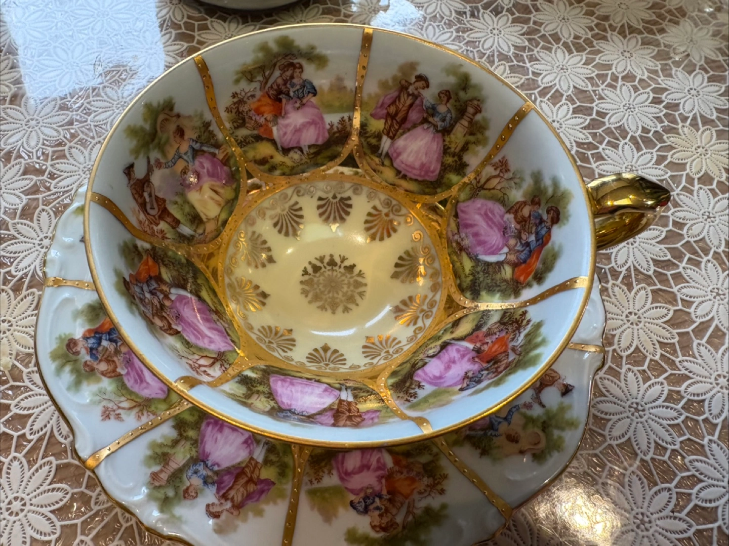 Beautiful vintage tea cup and saucer set featuring a delicate porcelain design with gold accents and a detailed pastoral scene. Perfect for collectors or adding a touch of elegance to your tea time