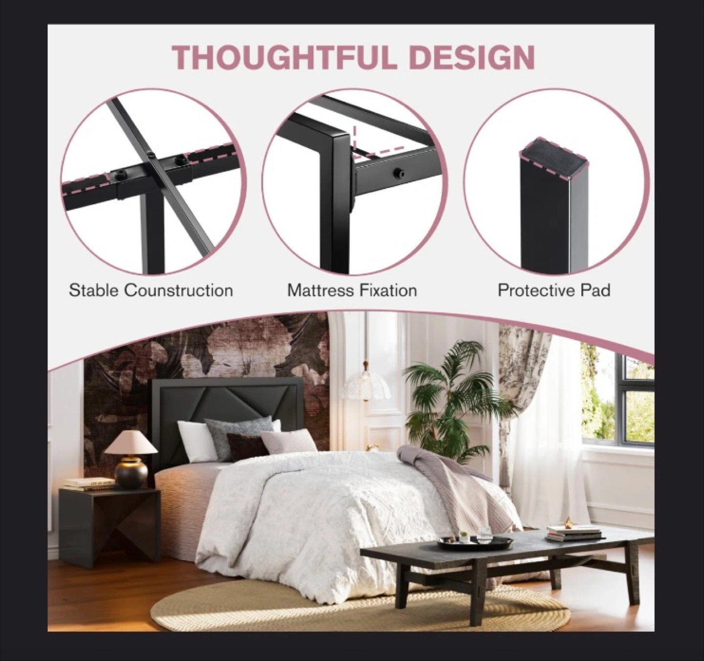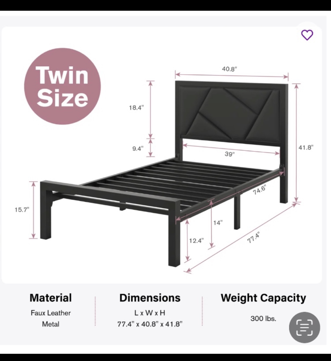 Selling a twin-size Bethina Upholstered Bed! It features a faux leather and metal construction with a weight capacity of 300 lbs. The bed frame dimensions are 77.4" x 40.8" x 41.8". It's designed with a stable construction, mattress fixation, and protective pads