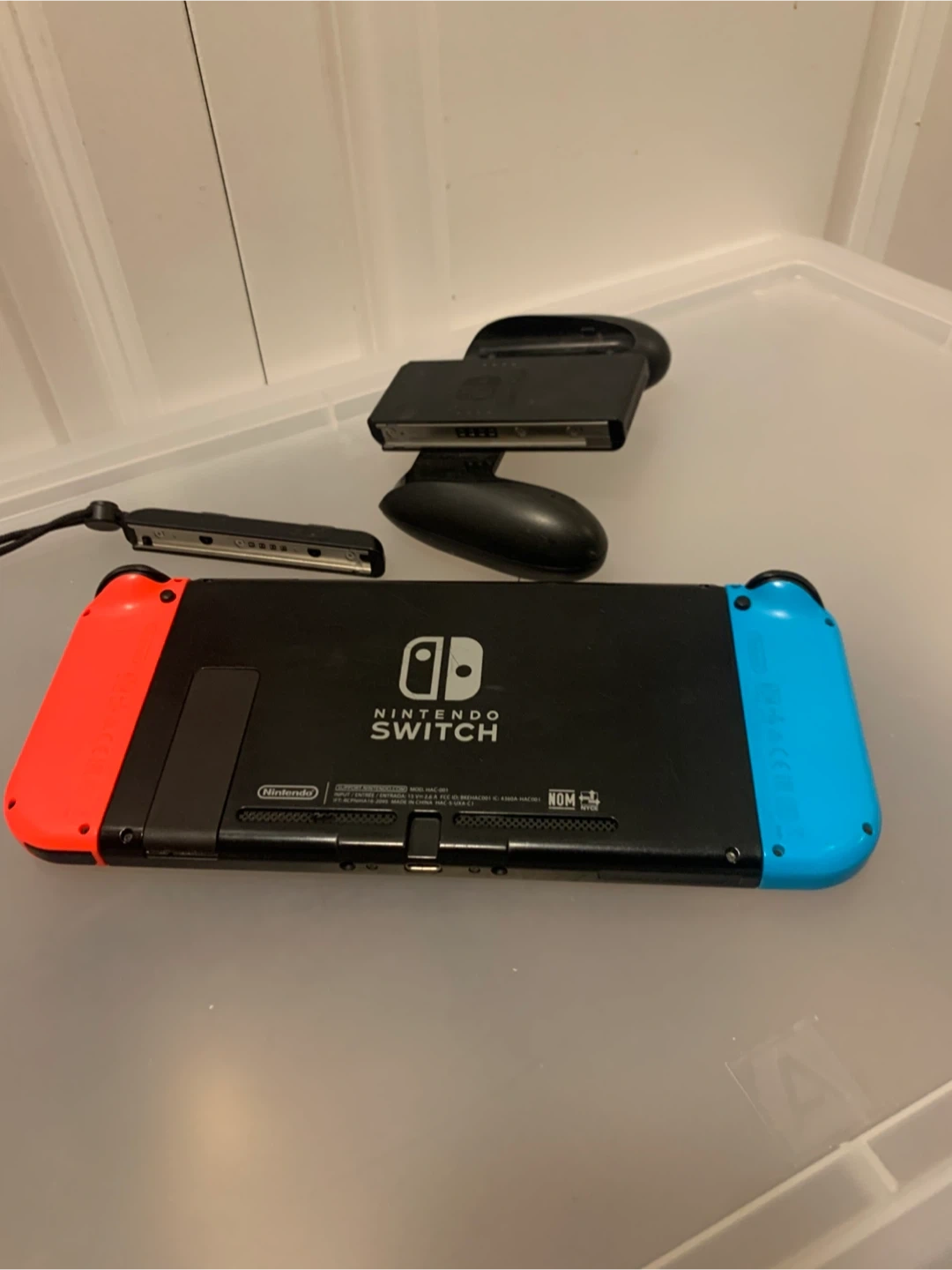 Nintendo Switch gaming console with red and blue Joy-Cons. Includes Joy-Con grip and wrist straps.