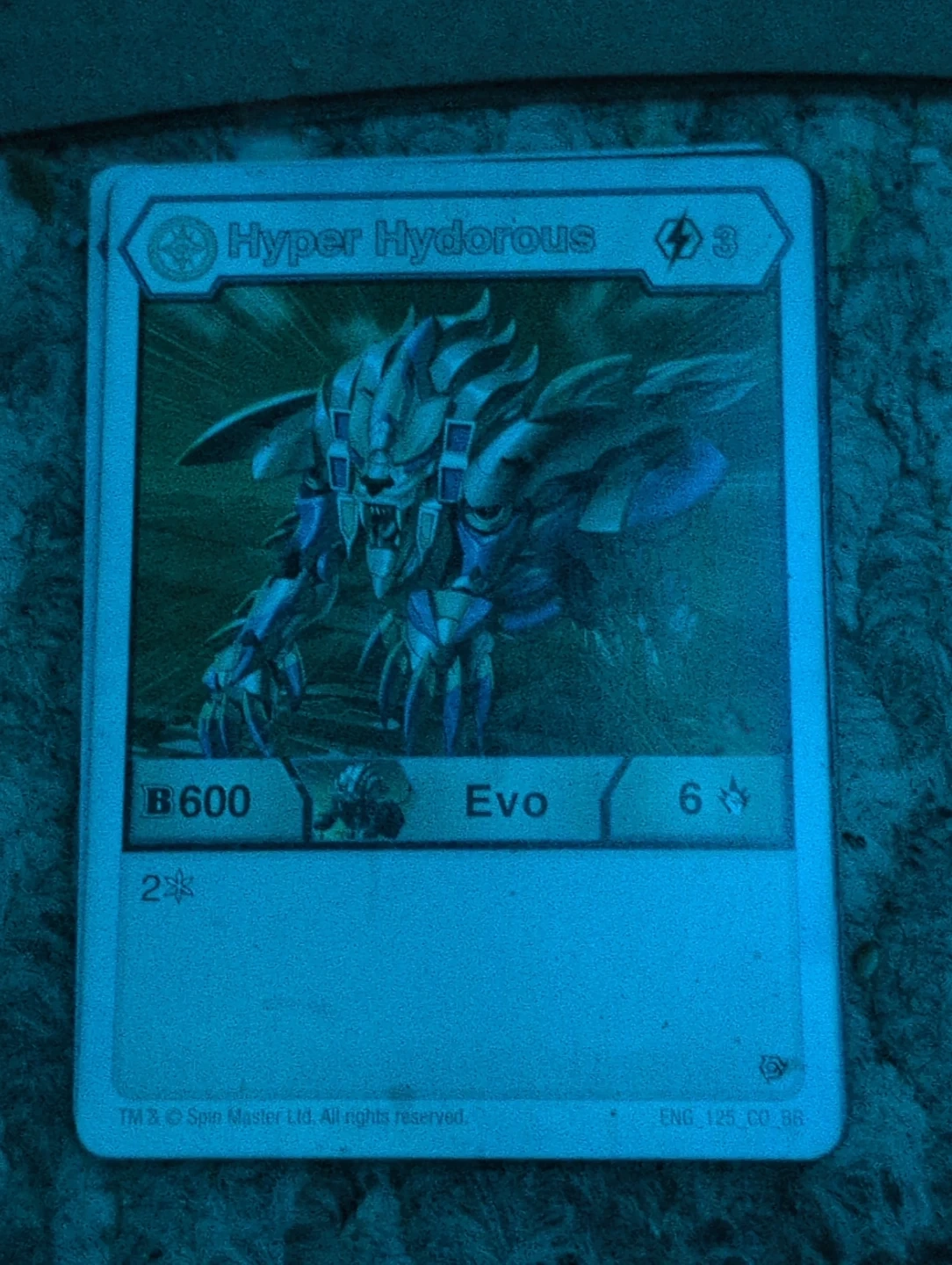 This is a Bakugan card featuring Hyper Hydorous. It has a power level of B600 and Evo 6. This card is from Spin Master Ltd.