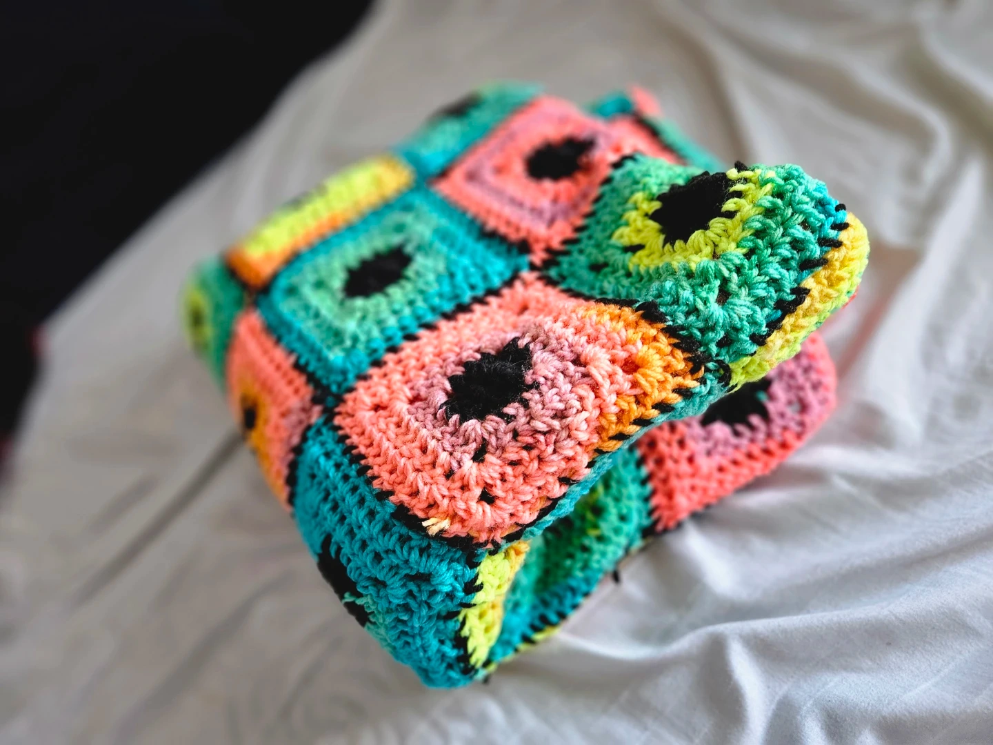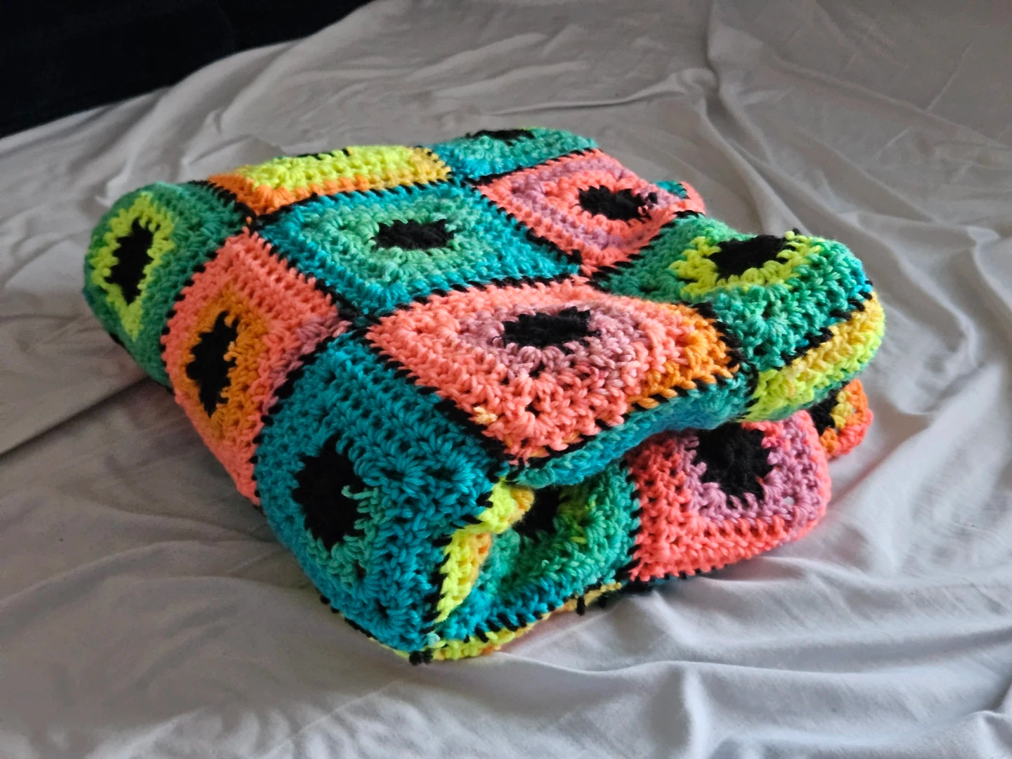 This is a vibrant, handmade crochet blanket featuring classic granny squares. It's a cozy throw made with colourful yarn, perfect for adding a pop of colour to any room. The squares are crocheted together to create a durable and soft textile.