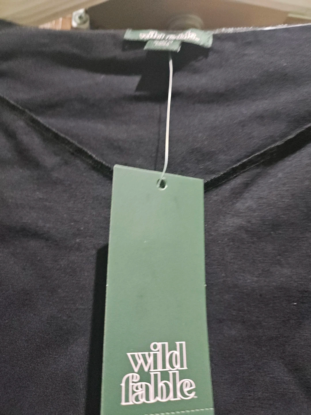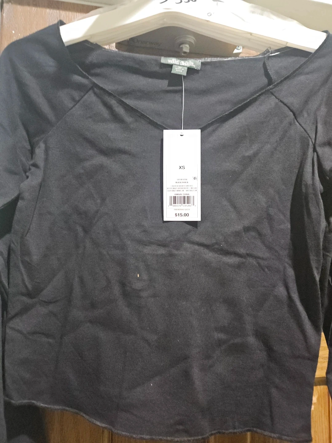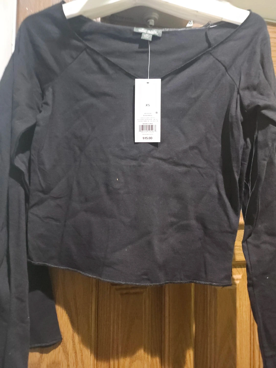This is a black long sleeve cropped top. It's a size XS. It's made of a soft cotton blend. Perfect for layering or wearing on its own!