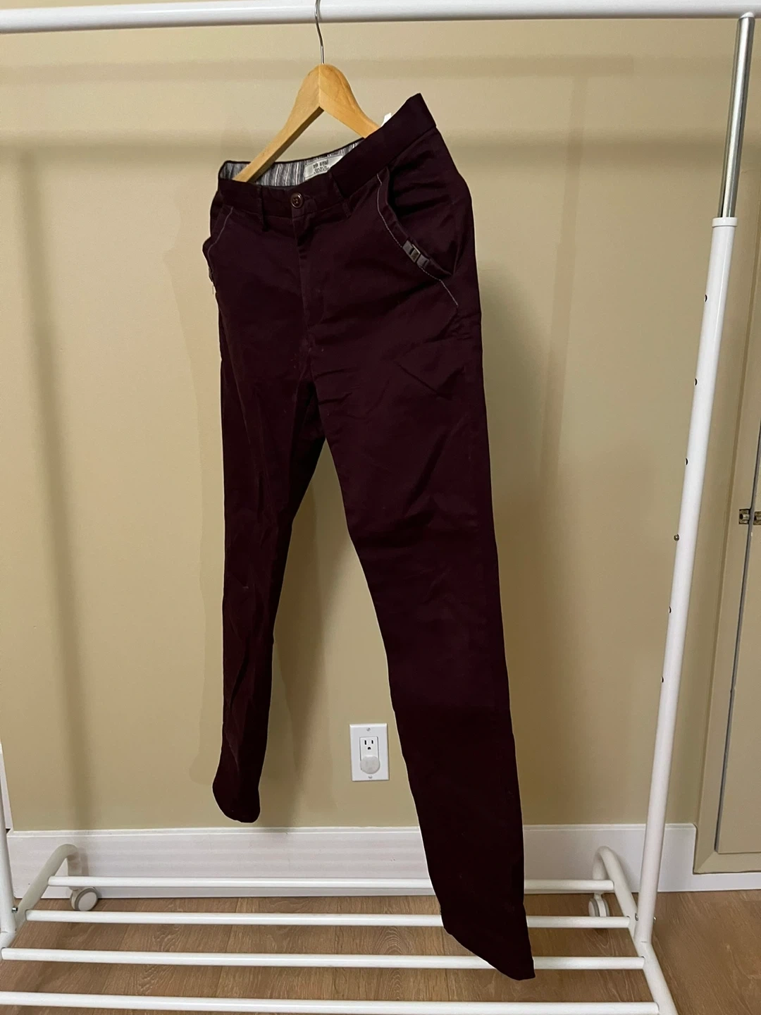 These are burgundy chinos with a slim fit. They're made of a cotton blend fabric for comfort. The chino style makes them versatile for casual or dressier occasions.