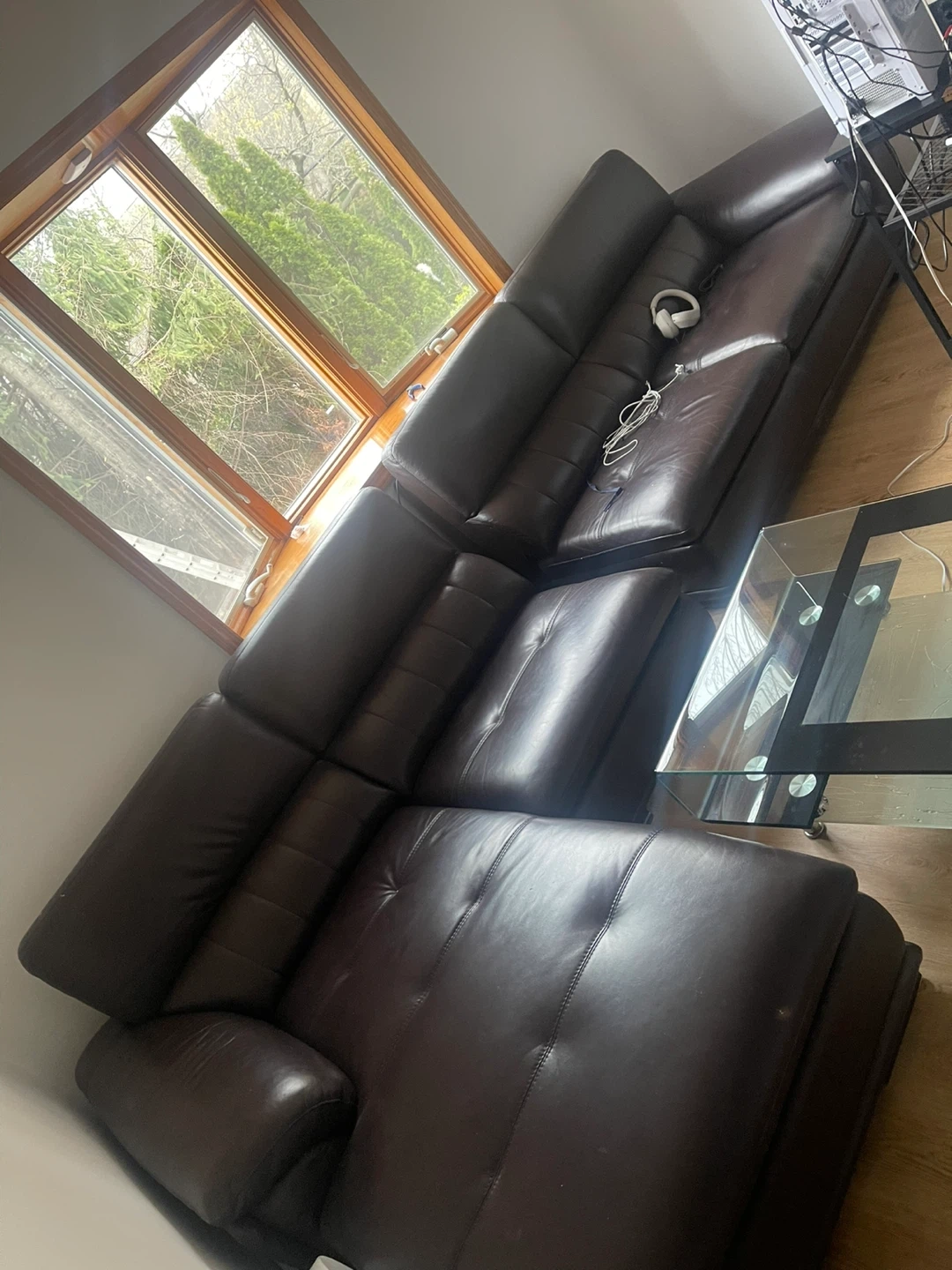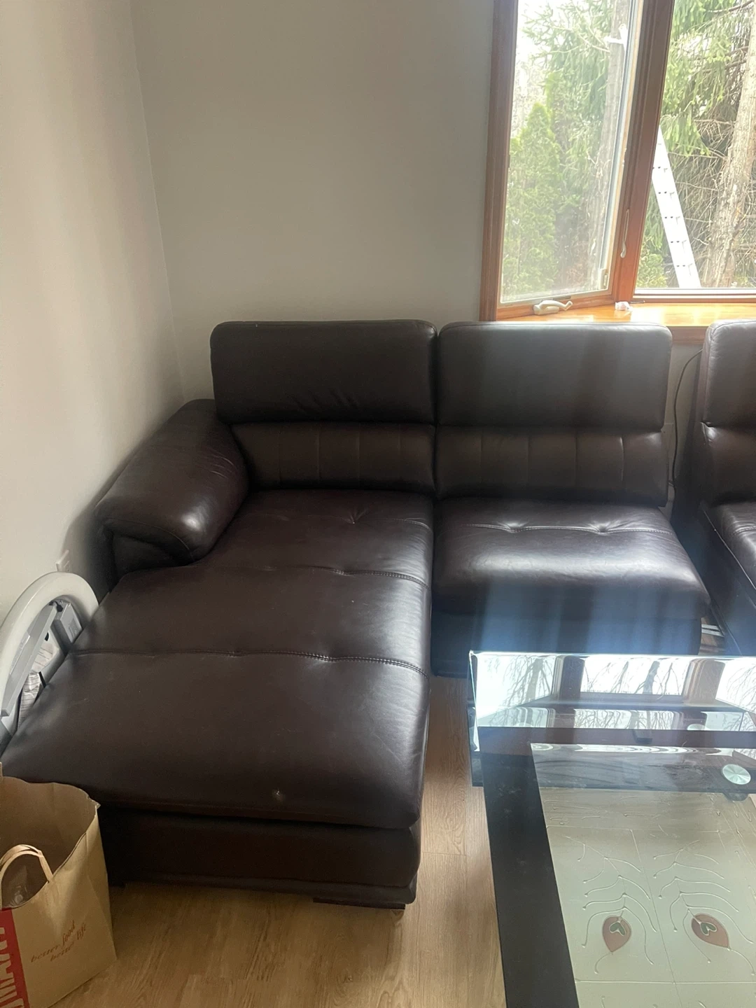 Spacious dark brown leather sectional sofa. It's made of leather and offers ample seating. Plenty of room for family and friends to gather! It’s not cheap leathers. It’s actual real leather so it will be lasting a long long time.
