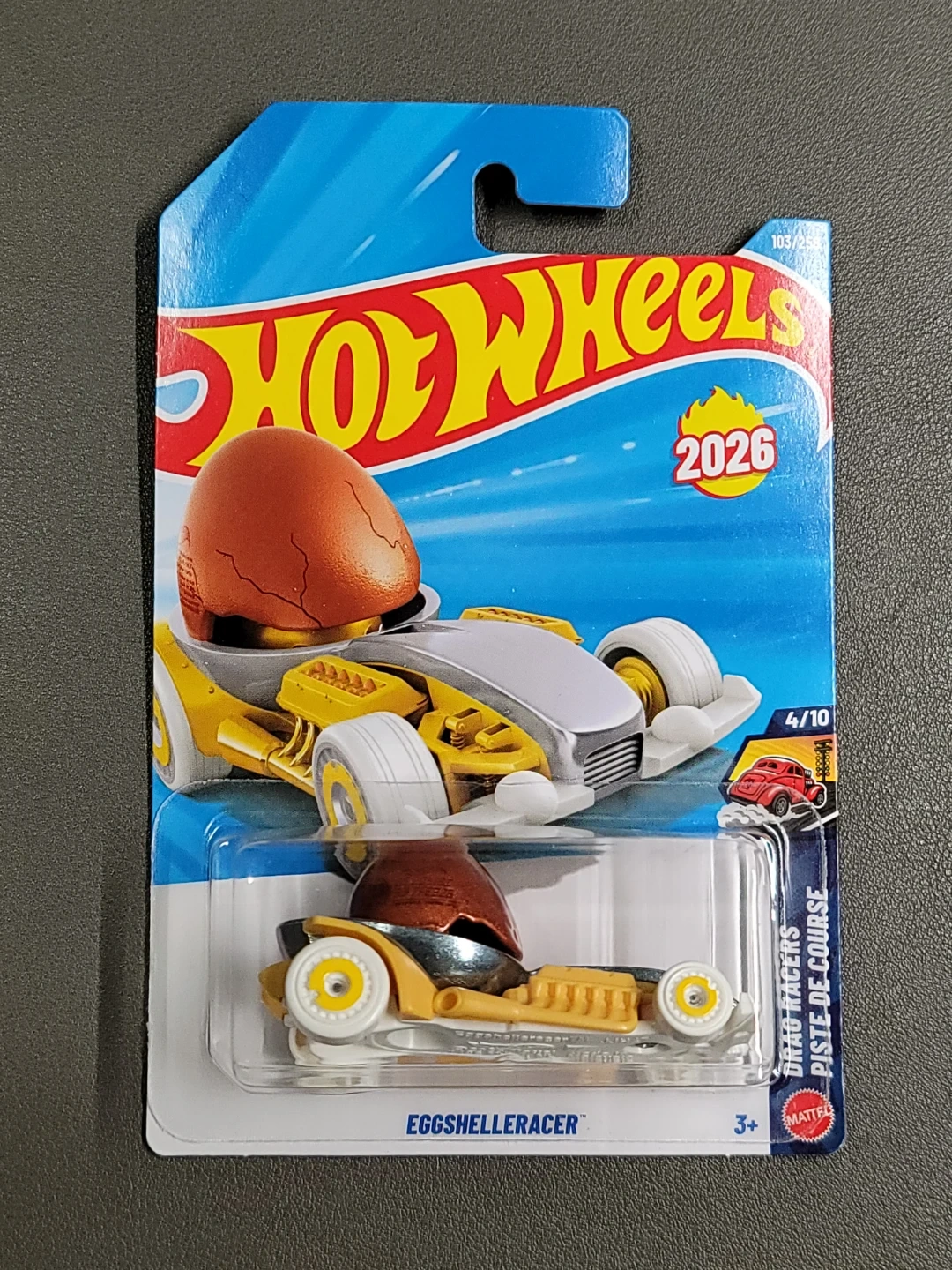 Hot Wheels die-cast toy car, Eggshelleracer model. Part of the Drag Racers series. Recommended for ages 3 and up.