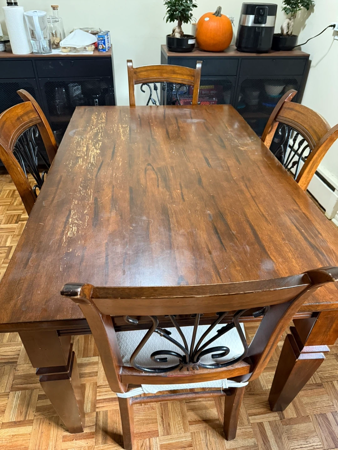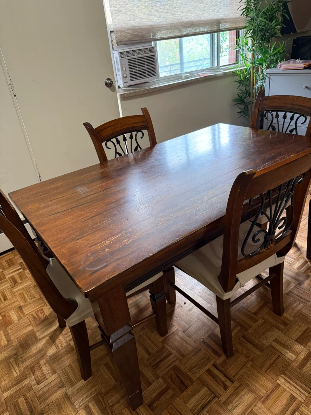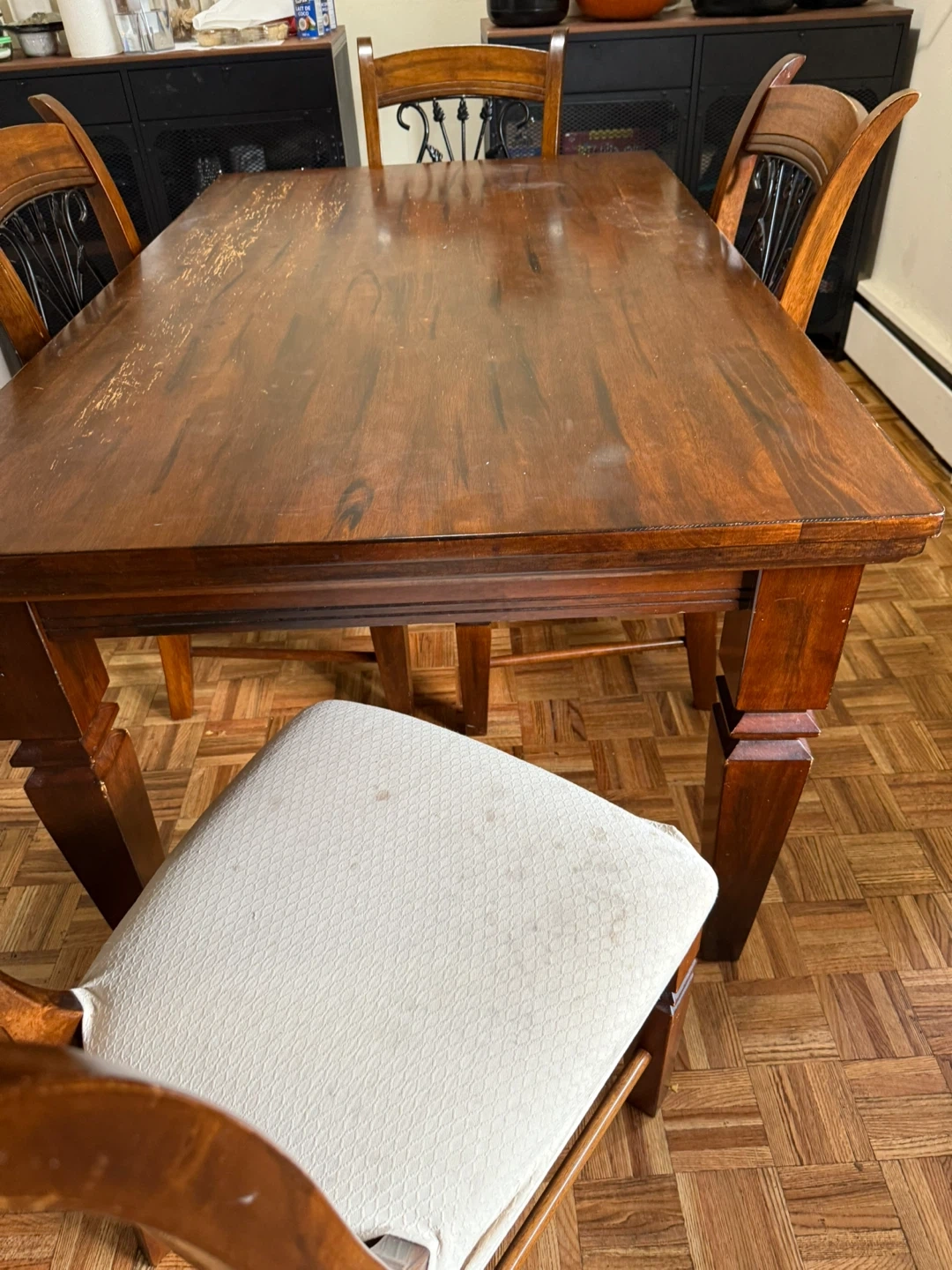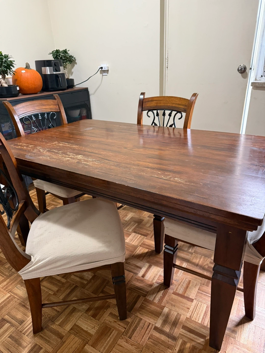Selling a dining table with four chairs. The table is a dark wood colour. The chairs have a decorative back and cream coloured seat cushions. There are some signs of wear and tear on the table top.