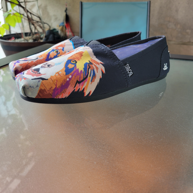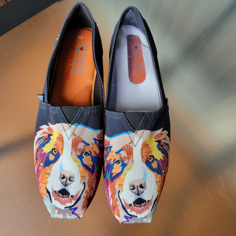 Selling a pair of BOBS Dogs slip-on shoes in a size 9. They feature a cute dog print on the front and a BOBS logo on the back. They are in perfect condition!