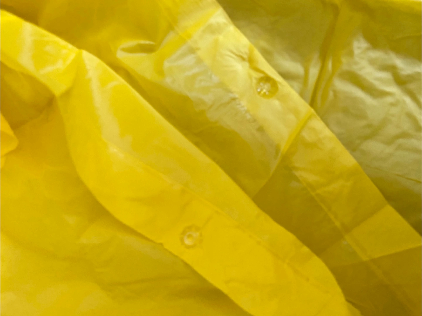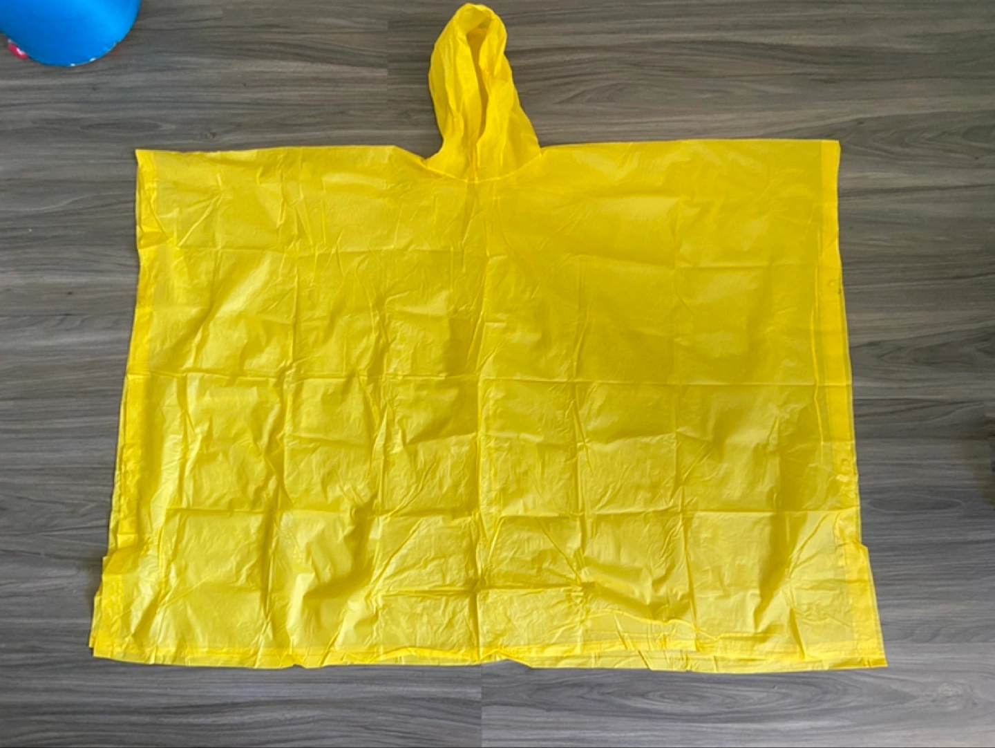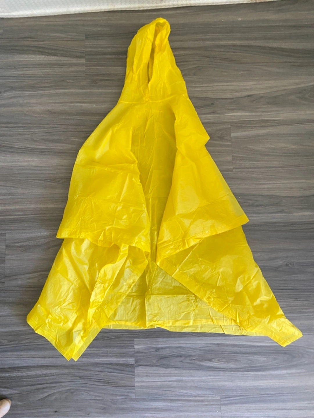 Here's a bright yellow rain poncho, perfect for staying dry on those wet days! It's lightweight and easy to pack, making it great for travel or keeping in your bag for unexpected showers