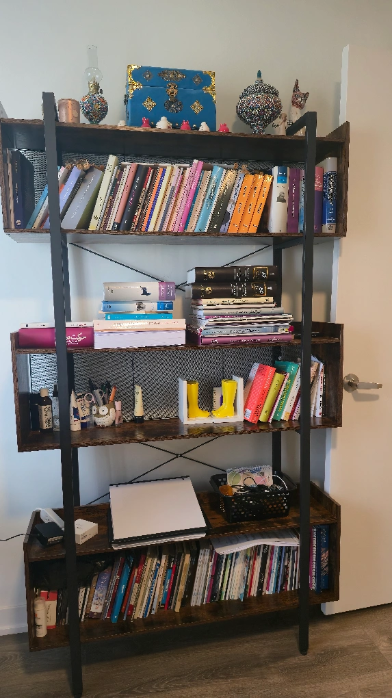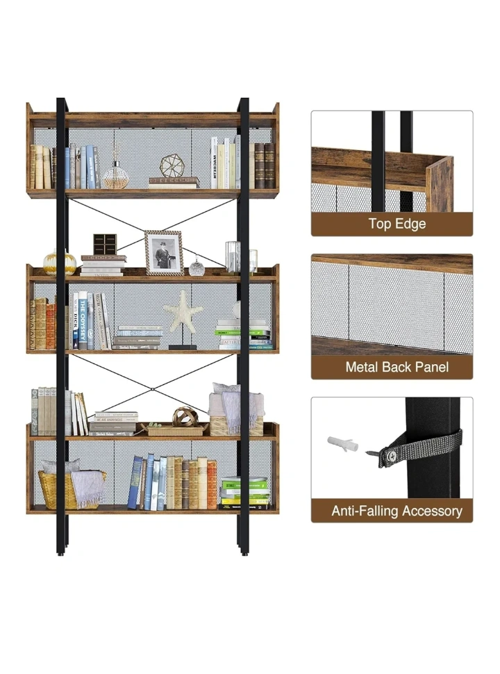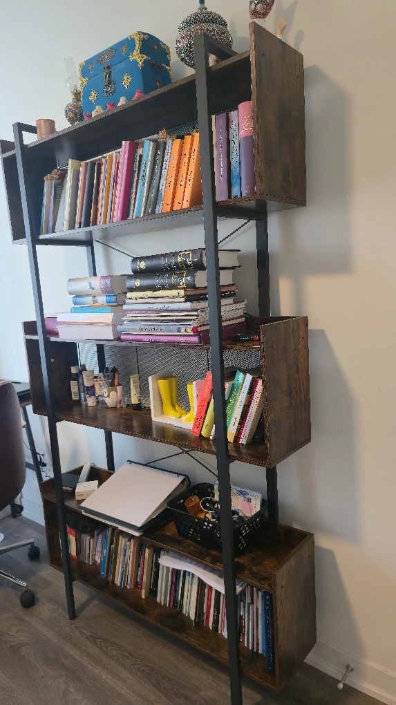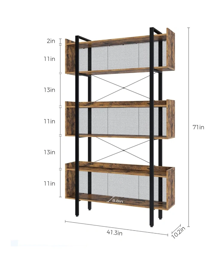 Selling a bookshelf with an industrial style. It's 71 inches tall, 41.3 inches wide, and 10.2 inches deep. The shelves are a wood-look finish with metal supports and a mesh back panel. It's a great way to add storage and style to any room!