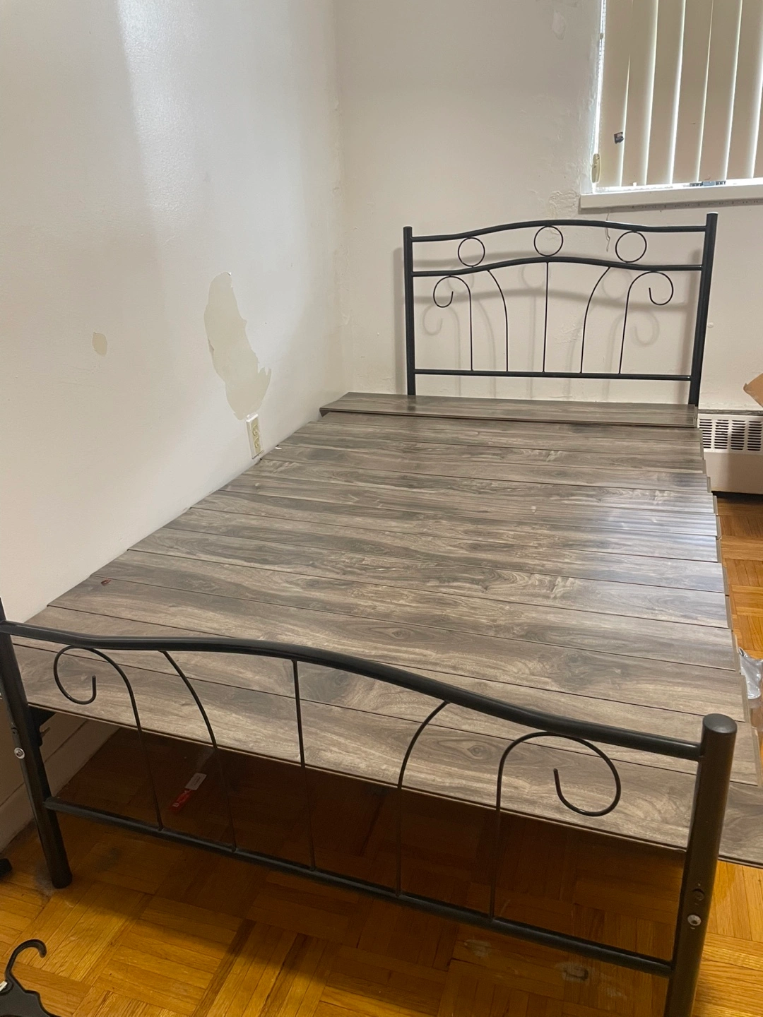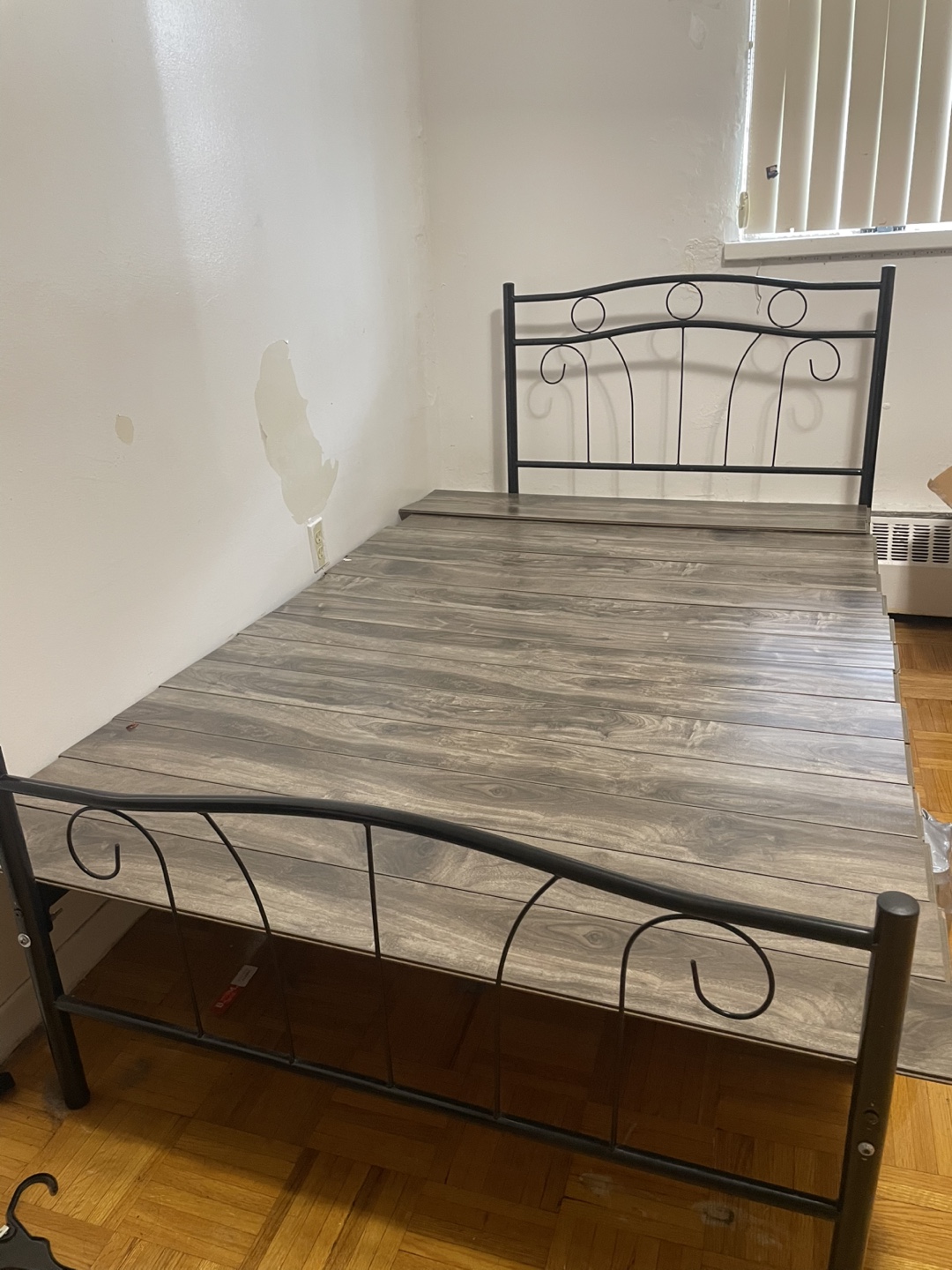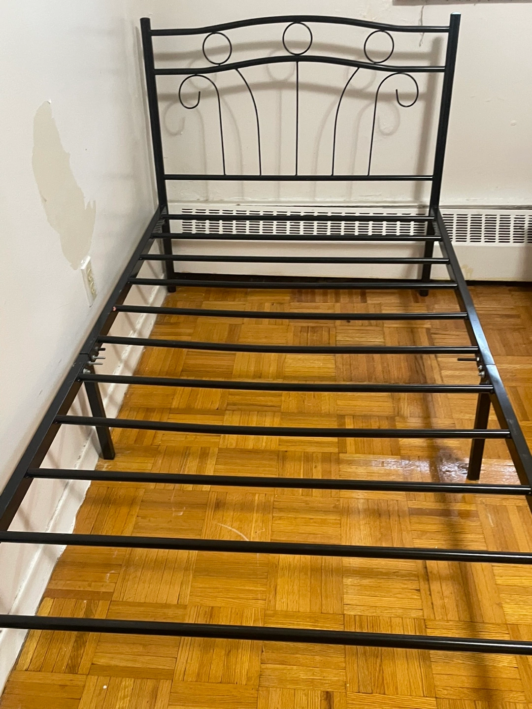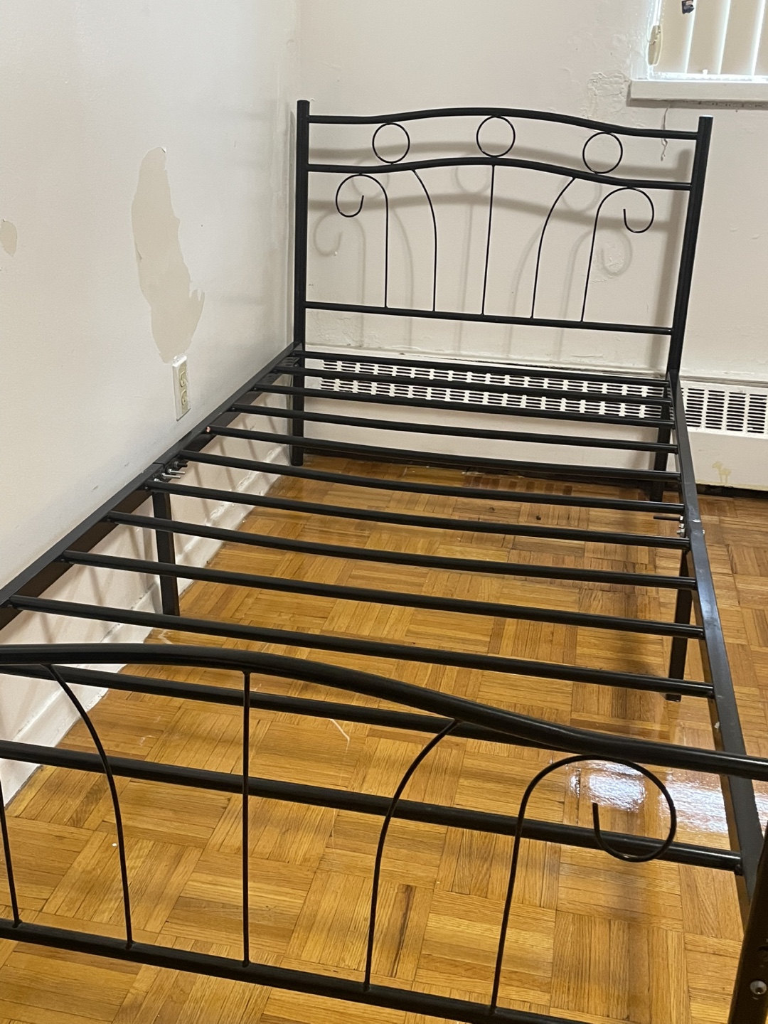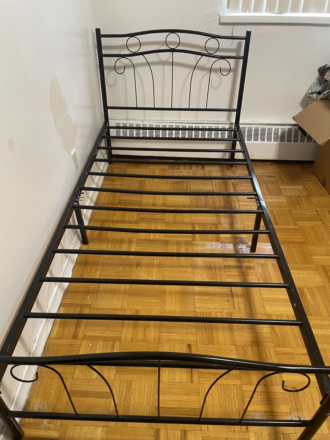 Selling a black metal bed frame. It's in good condition and ready for a new home! Perfect for adding a touch of elegance to your bedroom. It comes with wooden slates if you not. *NOT necessary to have*