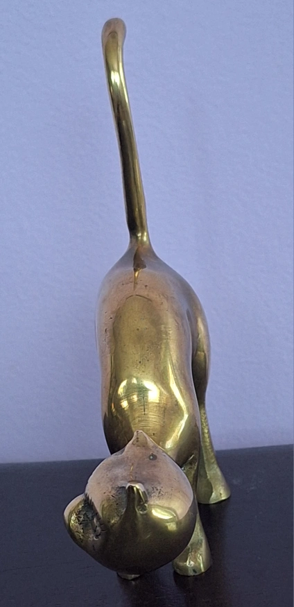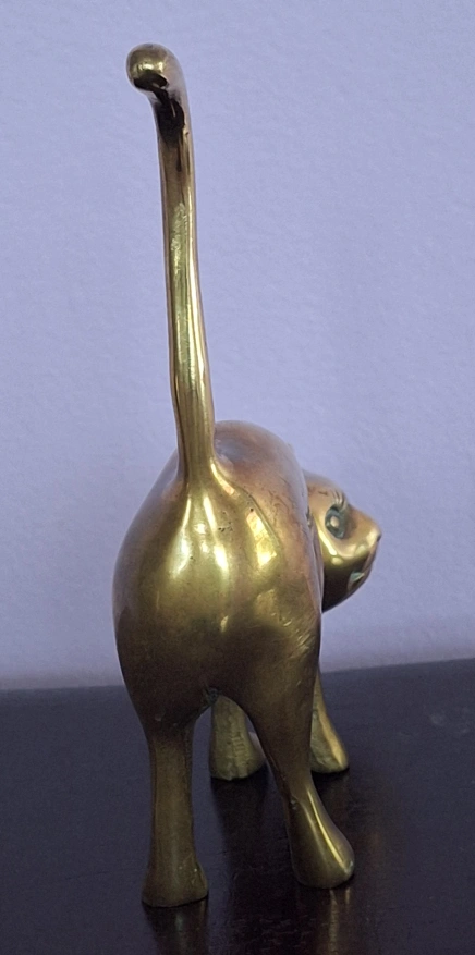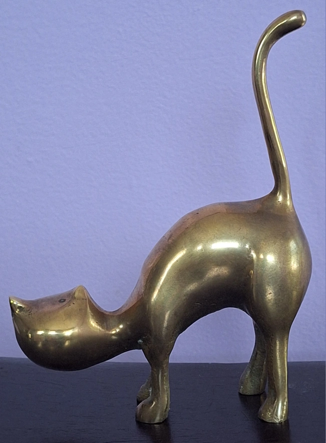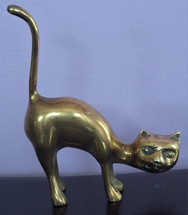 71Vintage scaredy cat solid brass figure, uses as a rings holder. Mid-century modern