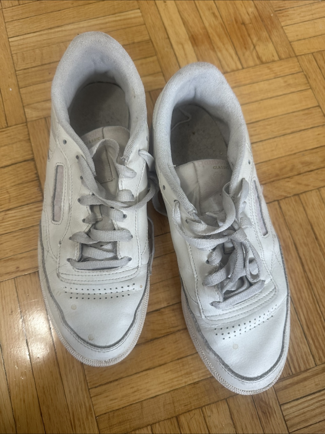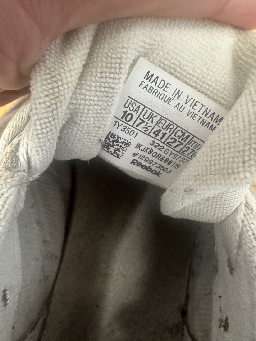 Giving a pair of Reebok Classic sneakers in white. They are a size 10 (US).