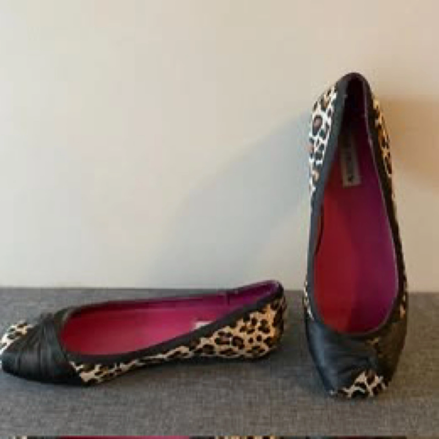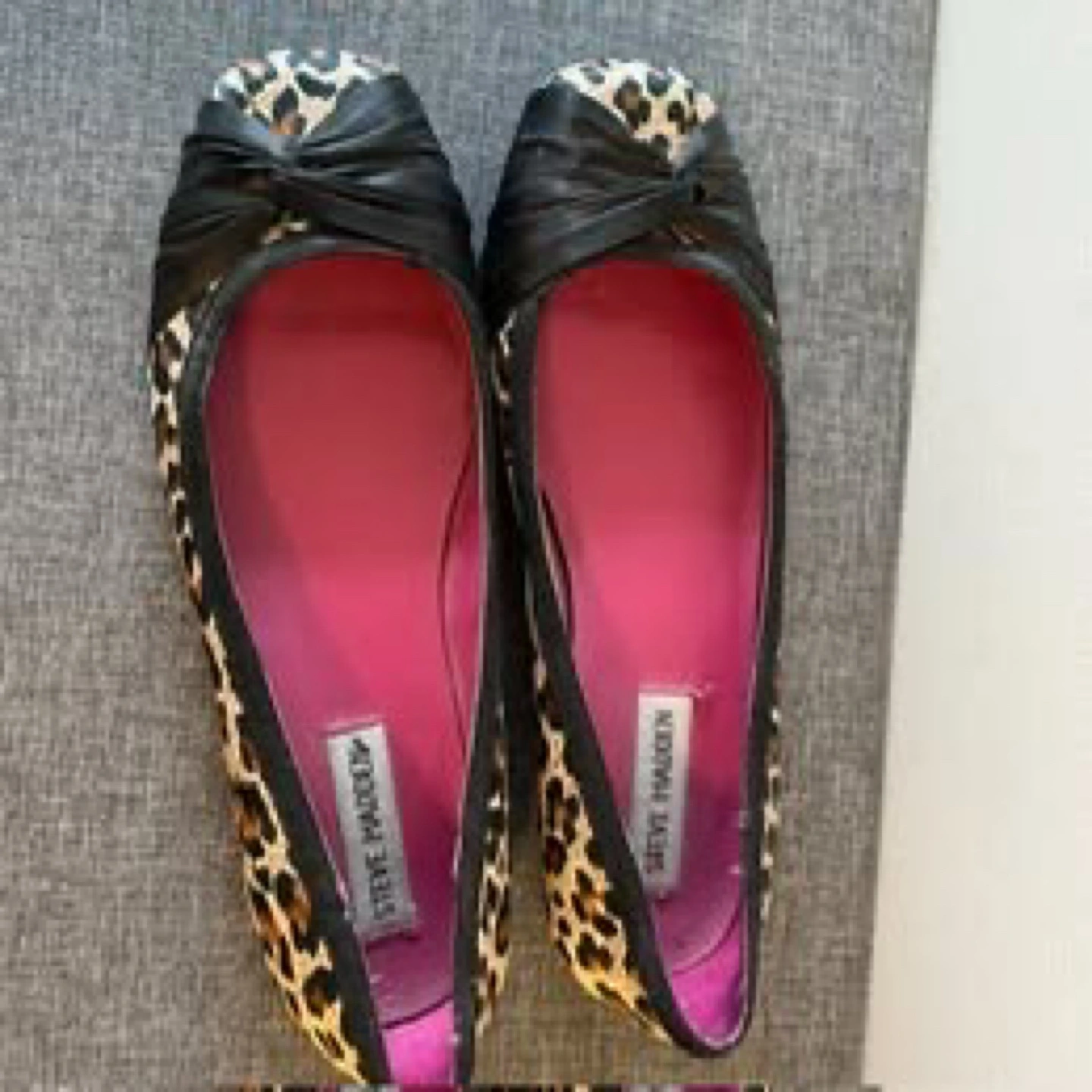 Cute Steve Madden ballet flats with a fun leopard print! They feature a black accent on the toe and a bright pink insole. Size 8