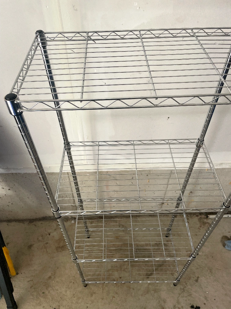 Here's a handy chrome wire shelving unit! It's perfect for adding some extra storage in your kitchen, garage, or anywhere else you need it. It has three shelves and is in good shape.