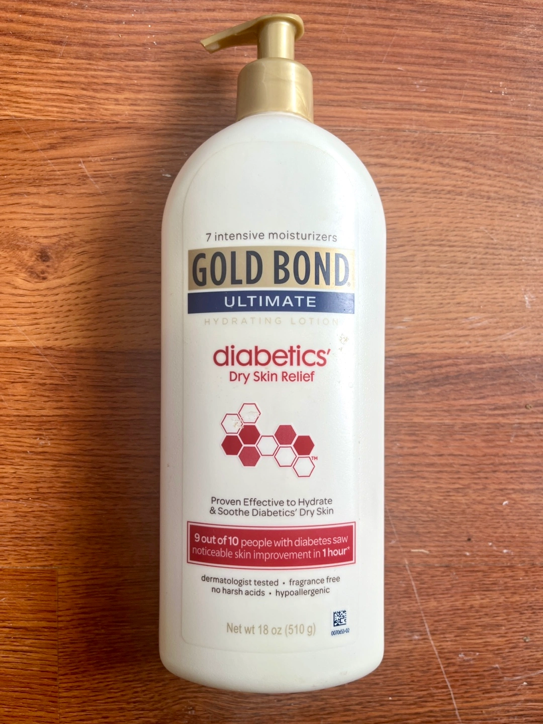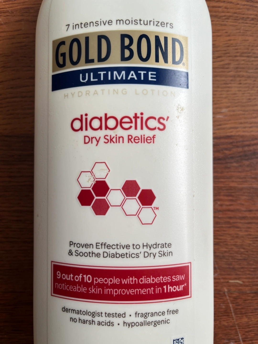 I'm selling an almost full large bottle of Gold Bond Ultimate Hydrating Lotion for Diabetics' Dry Skin Relief. It contains 7 intensive moisturizers and is dermatologist tested, fragrance-free, and hypoallergenic. Proven effective to hydrate and soothe diabetics' dry skin. Net weight 18 oz (510 g)