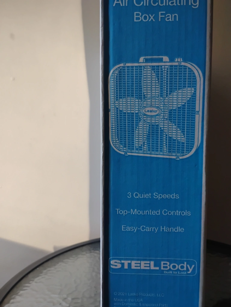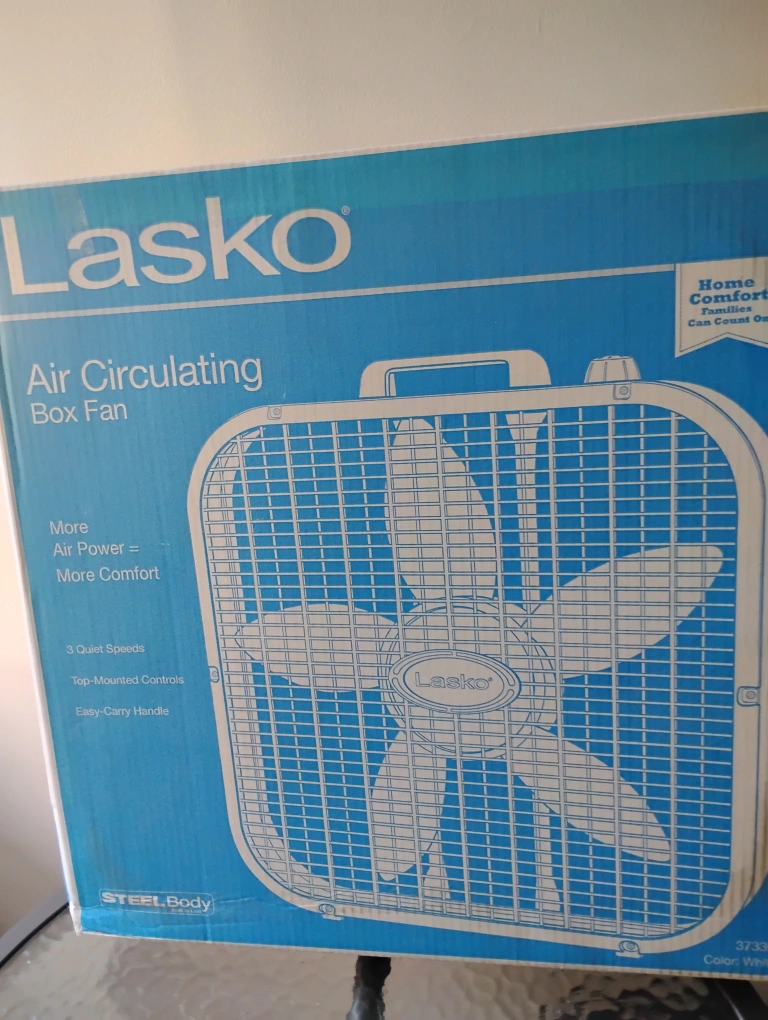 Selling a Lasko air circulating box fan.Still in the Box not used It's white and has a steel body. It features 3 quiet speeds, top-mounted controls, and an easy-carry handle. Great for keeping cool!