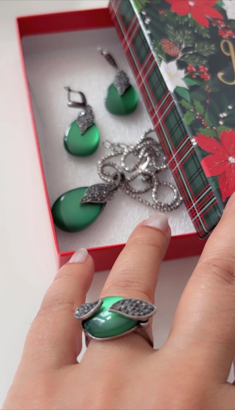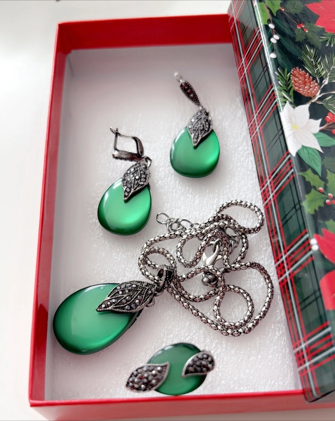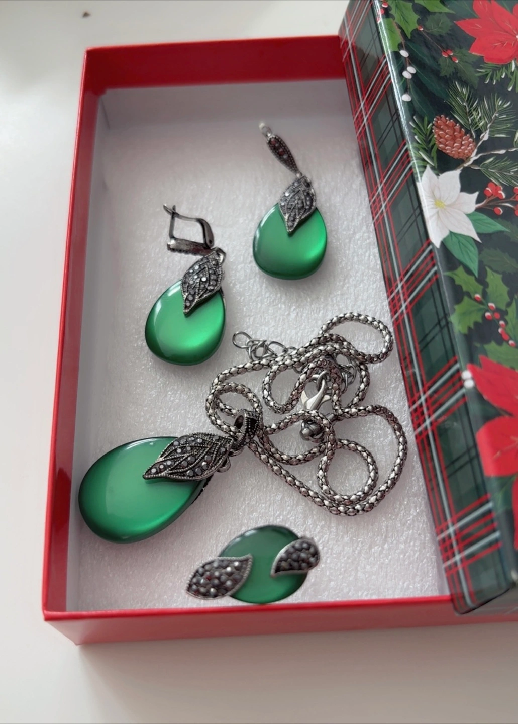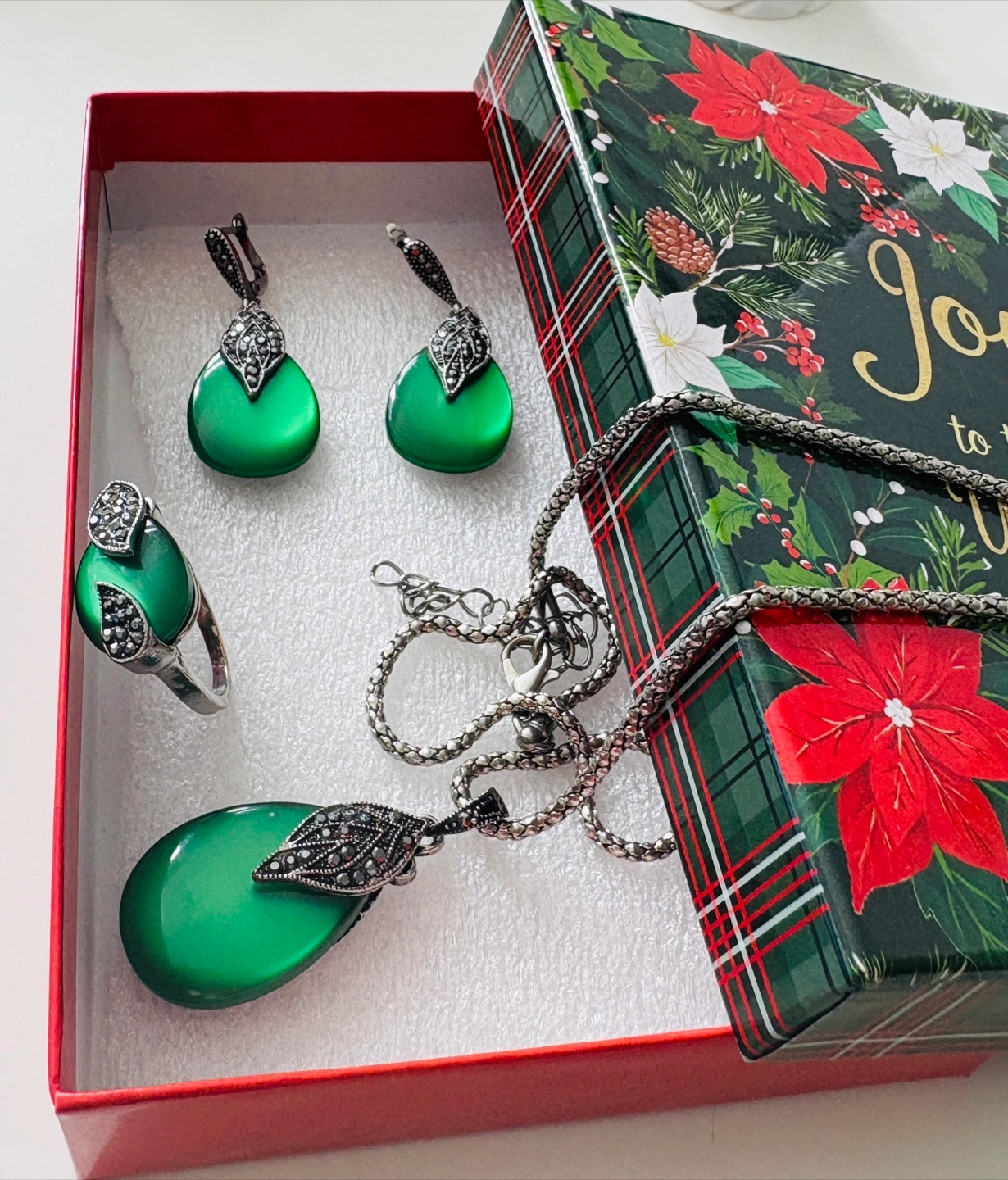 Selling a beautiful green stone jewellery set! It includes a necklace, a pair of earrings, and a ring. The set comes in a decorative box, perfect for gifting or storing your new favourite pieces. The Ring is size 7.