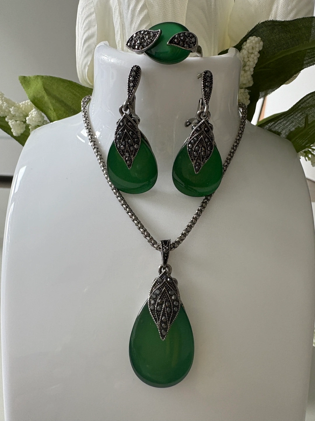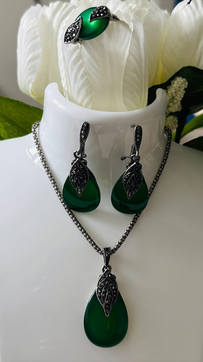 Green Stone Jewellery Set (Necklace, Earrings, Ring)