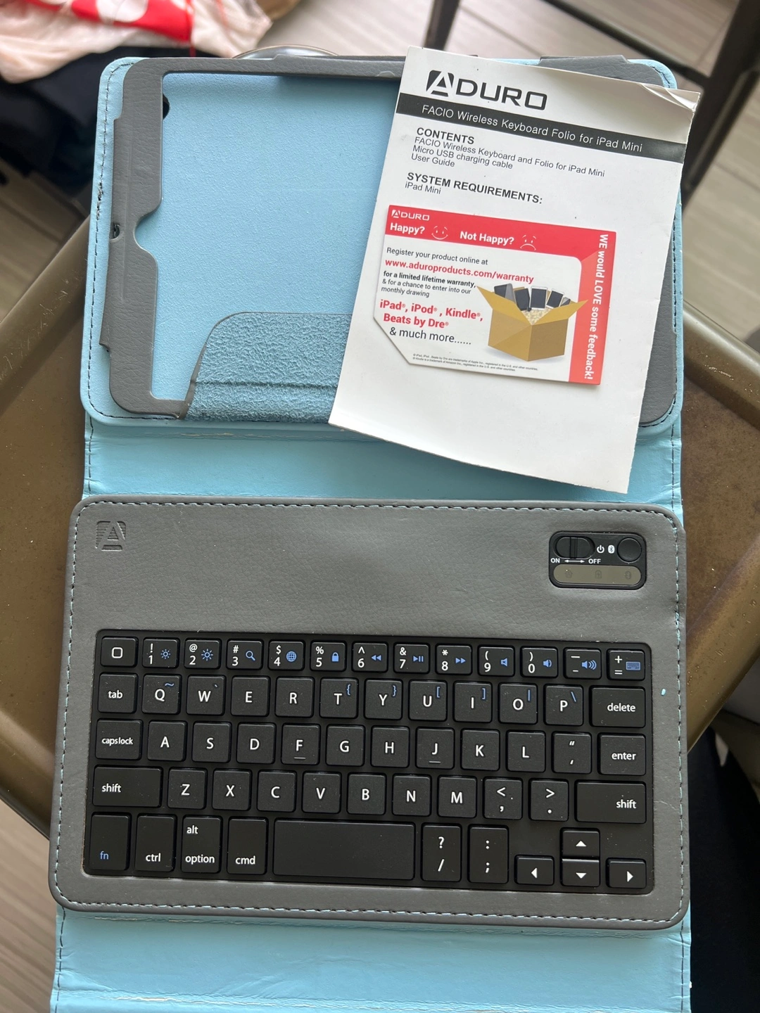 Selling a used Aduro Wireless Keyboard Folio for iPad Mini. It shows some signs of wear, but it's still functional. Includes the keyboard, folio case, and user manual