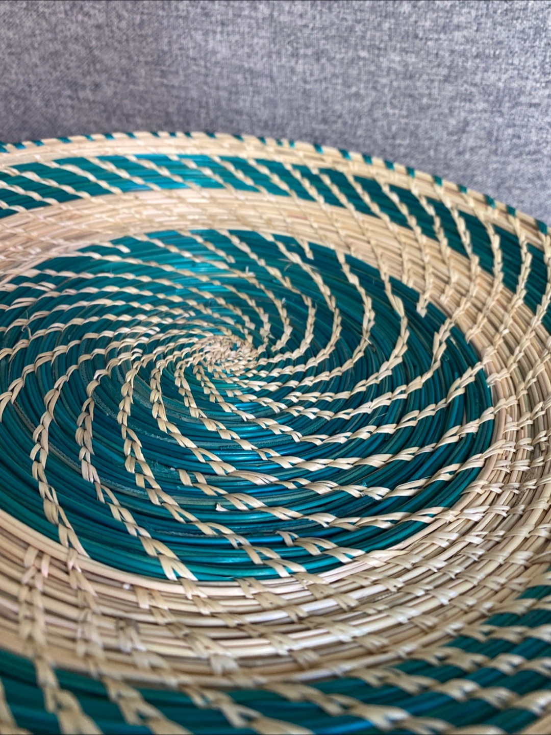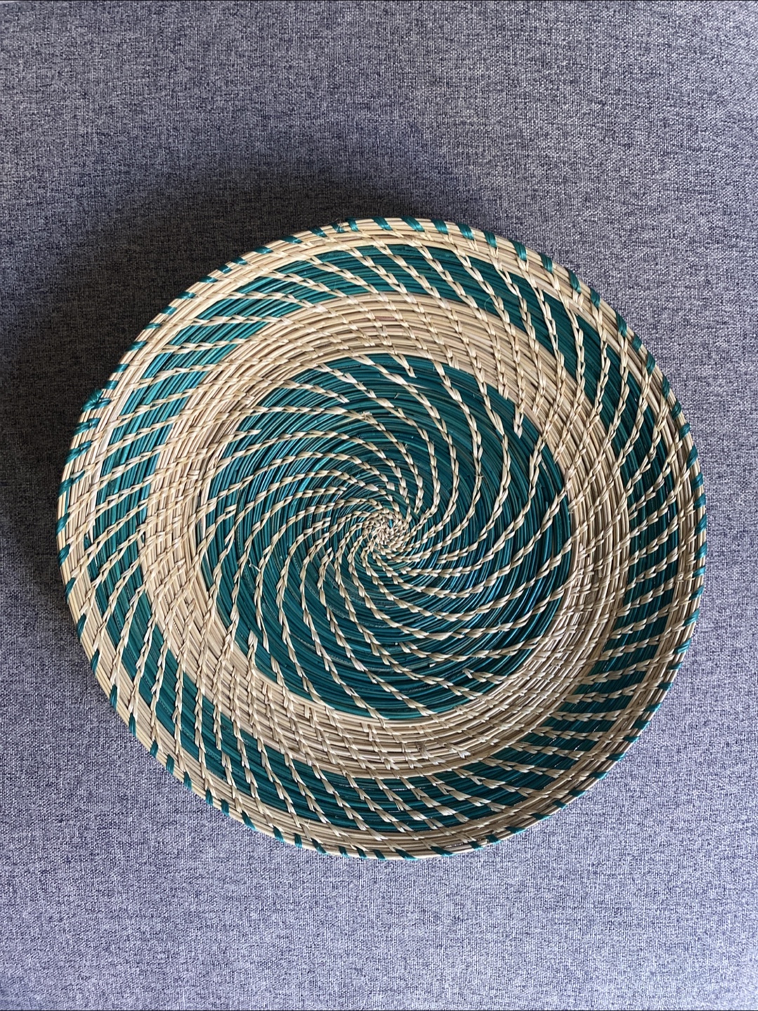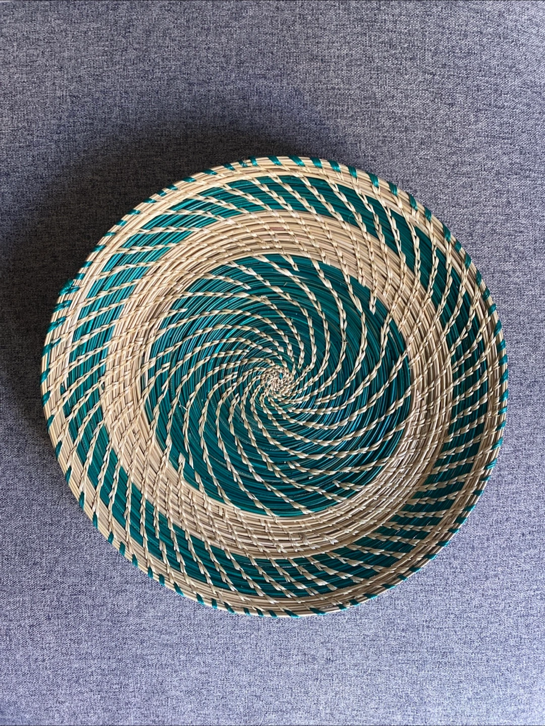 Selling a lovely handmade decorative basket! It features a woven design with alternating green and beige strands in a spiral pattern. It would look great as a centrepiece or wall decor in your home