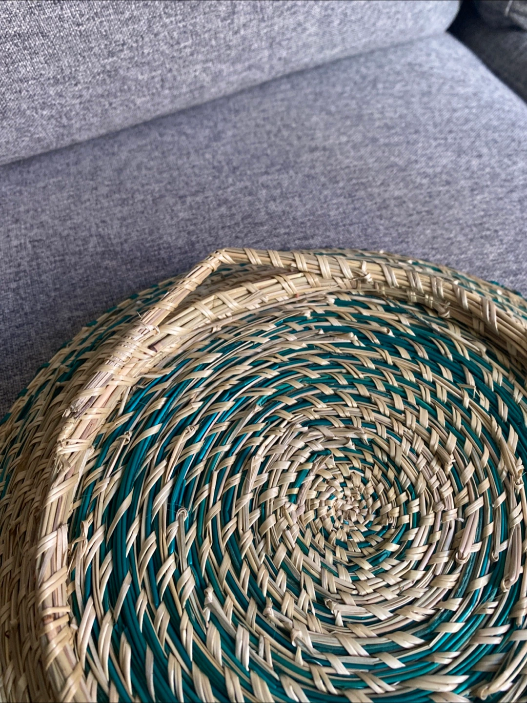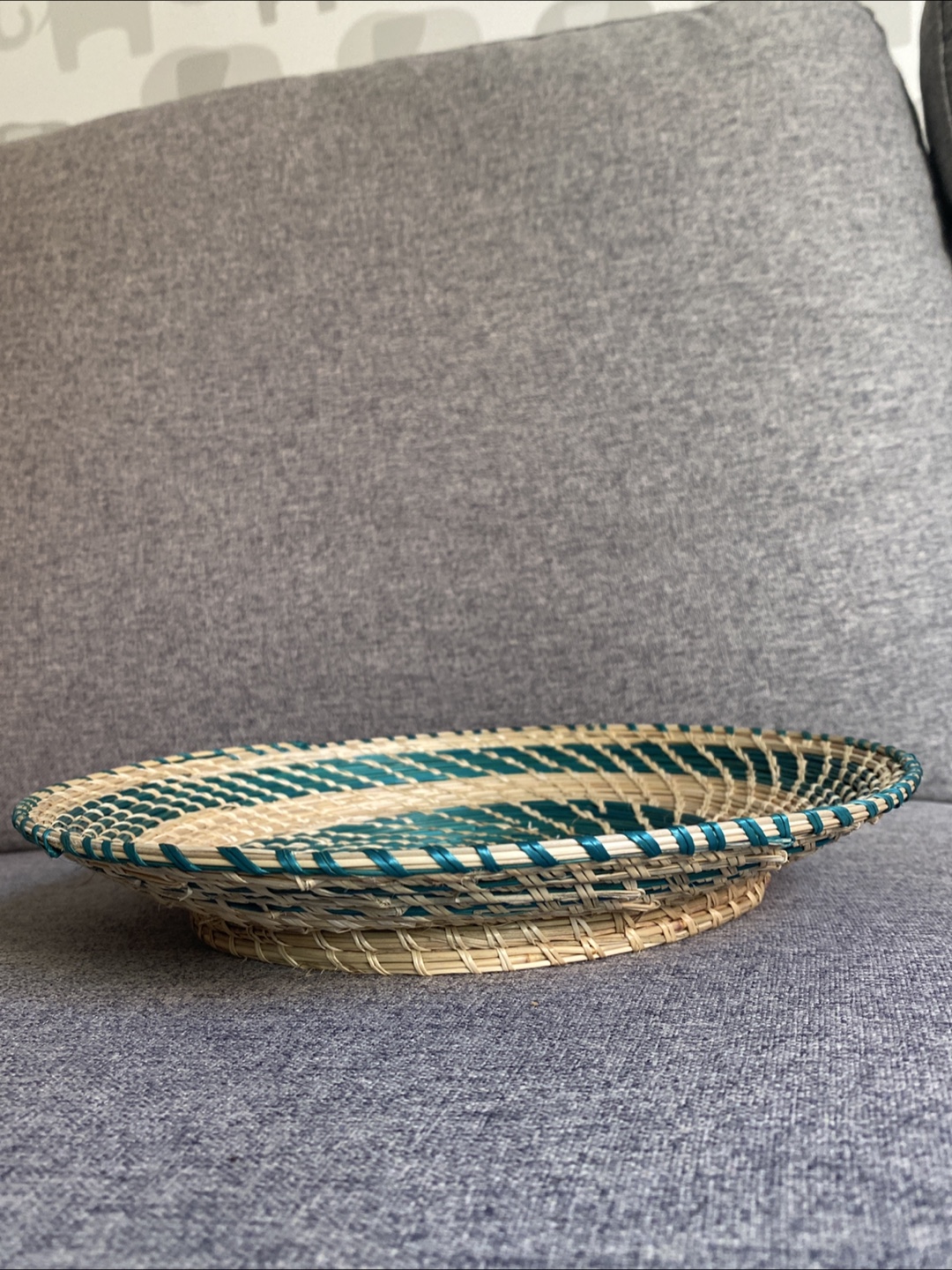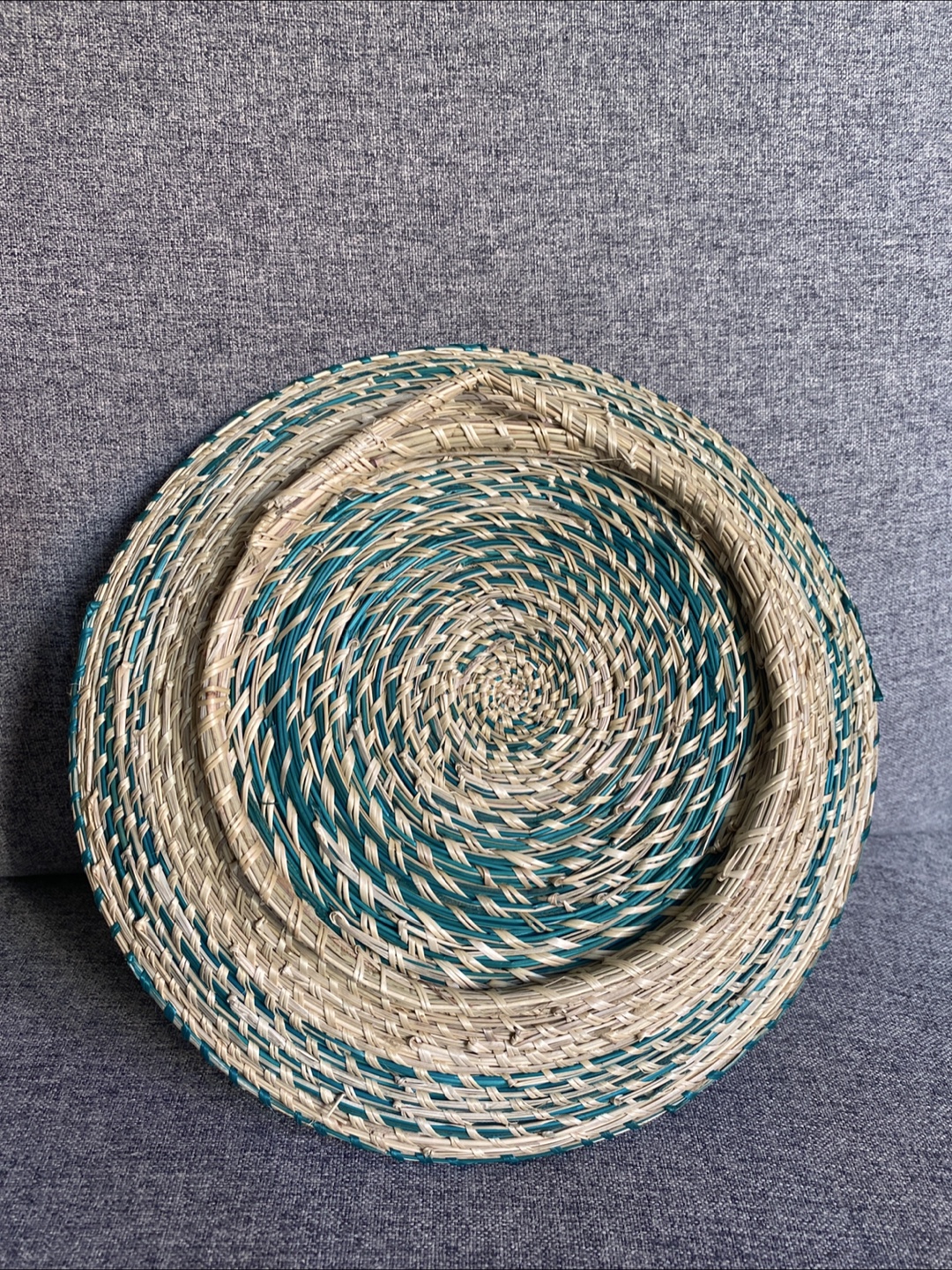 Selling a lovely handmade decorative basket! It features a woven design with alternating green and beige strands in a spiral pattern. It would look great as a centrepiece or wall decor in your home