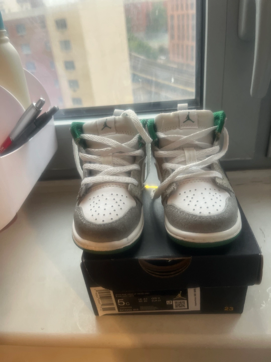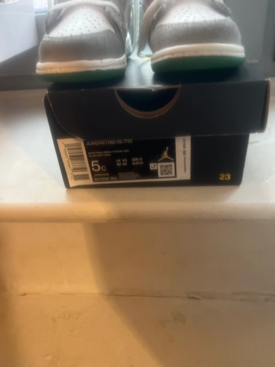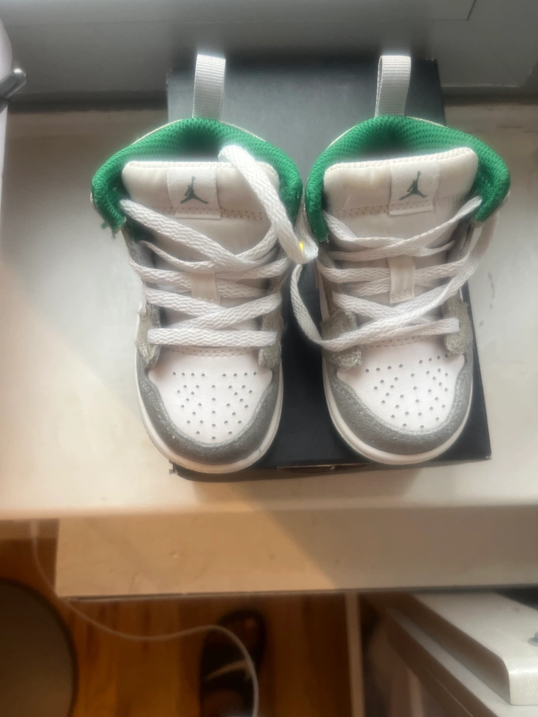 Selling a pair of Nike Jordan Mid SE (TD) toddler shoes in size 5C. They come with the original box. The color is a cute white/fire green/lt smoke grey.