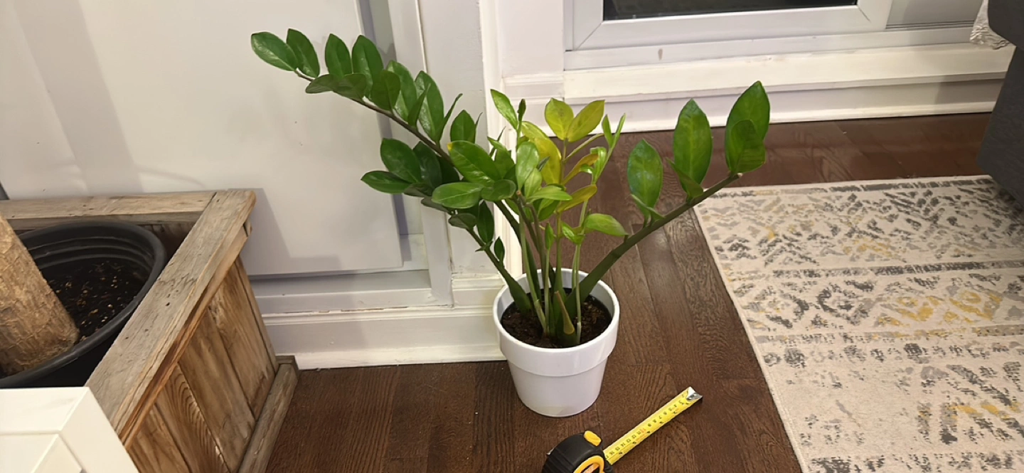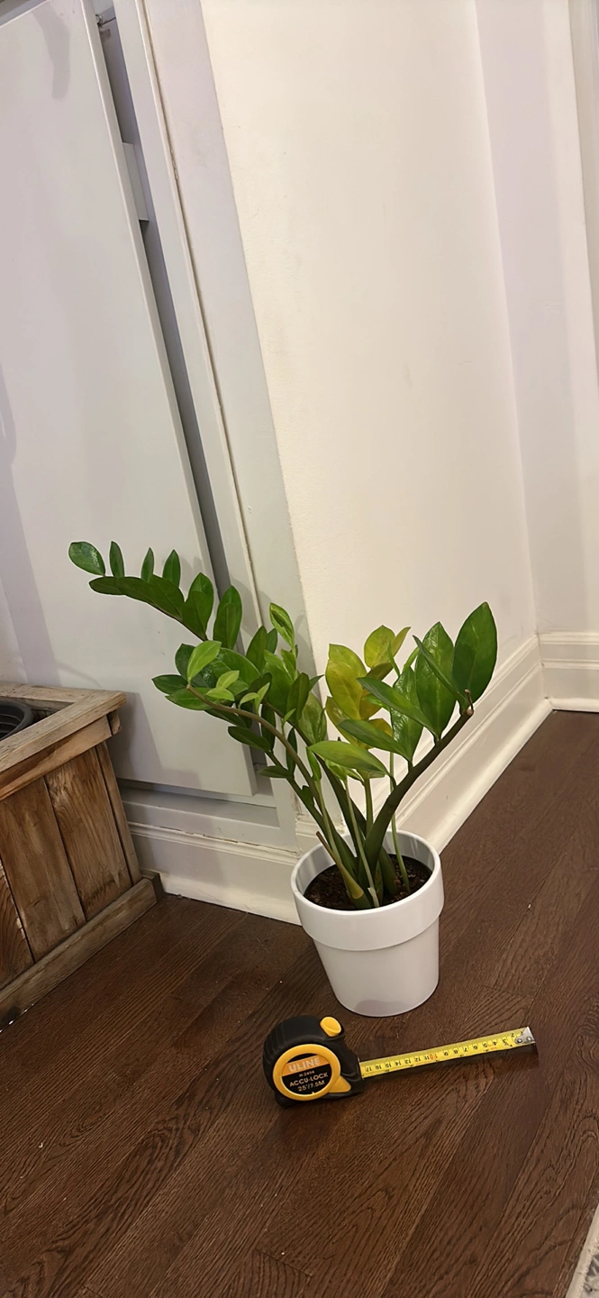 Zz plant or zamicro in white 7” pot, measuring 2 feet or 60 cm from bottom to top.