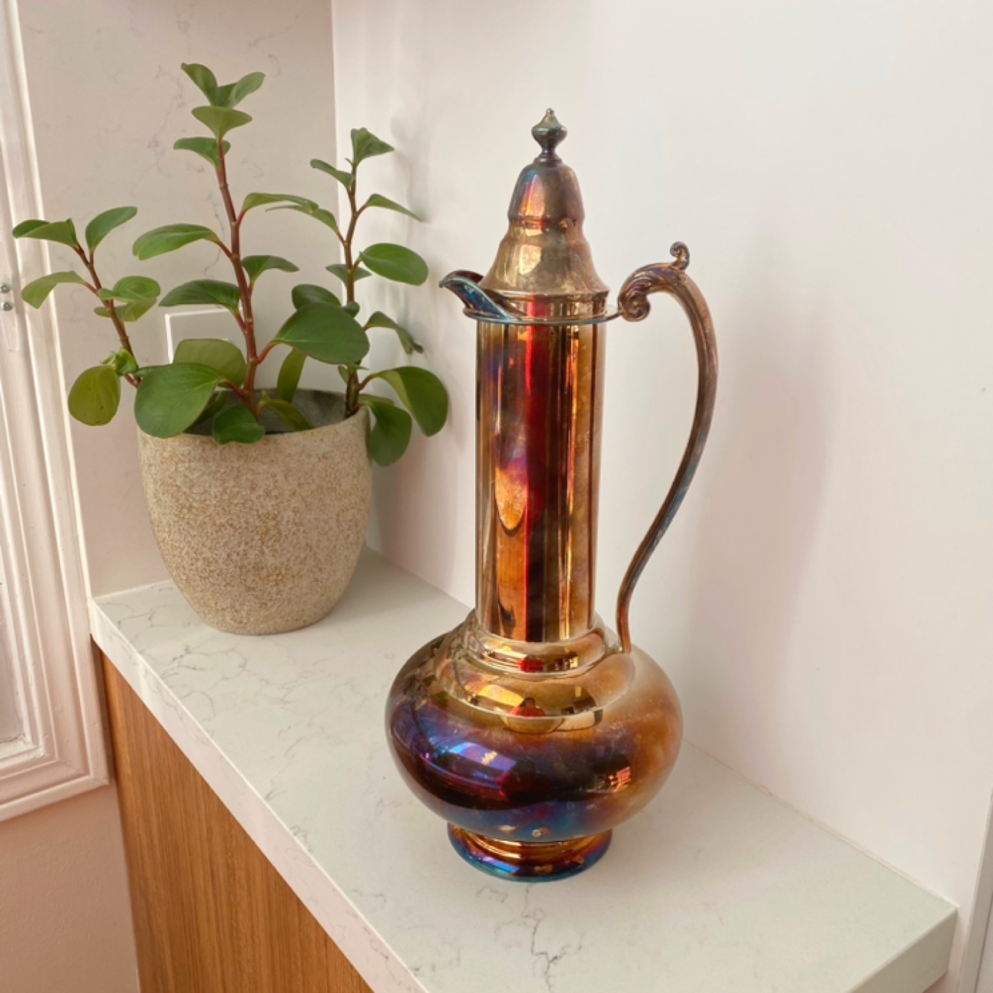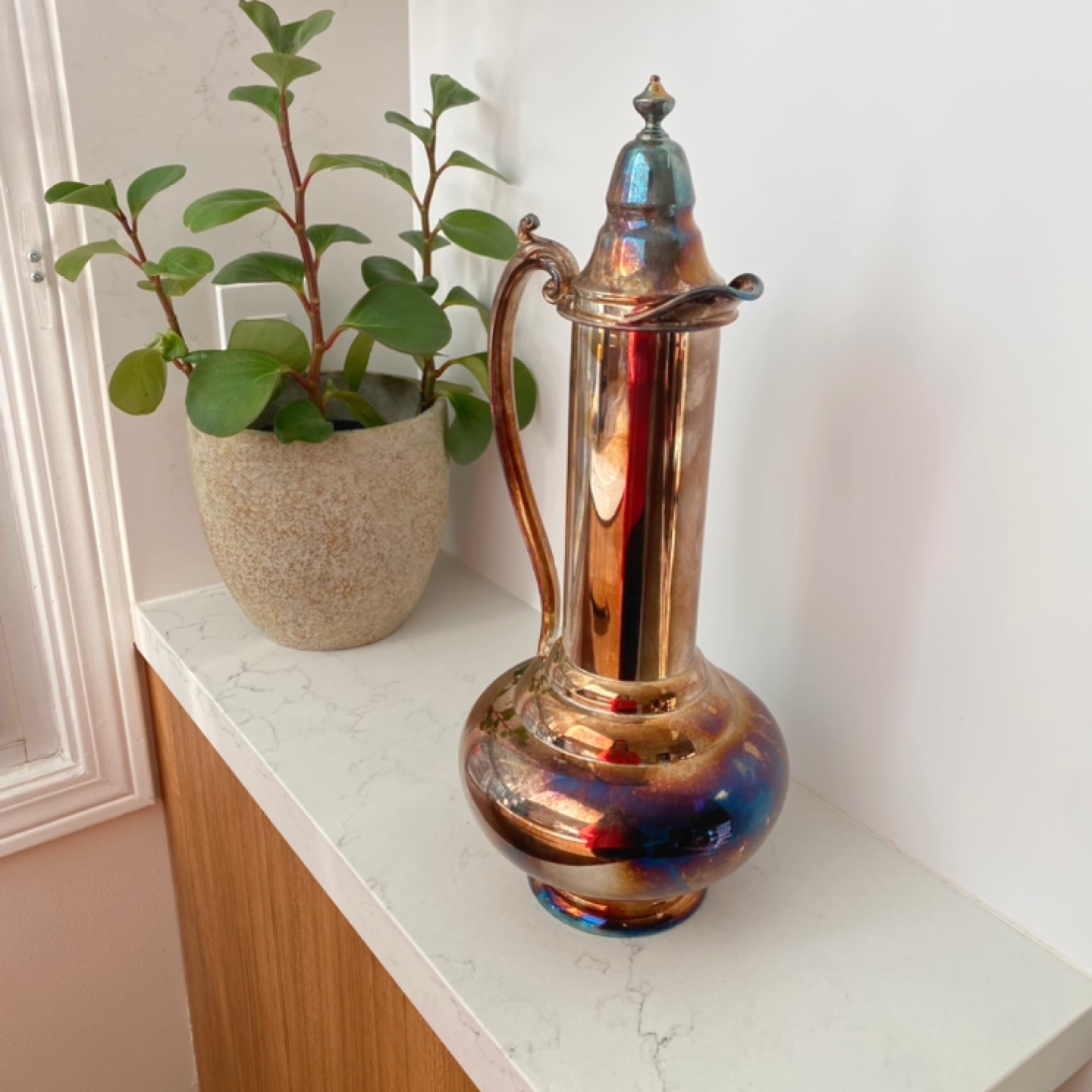 Selling a vintage silver plated water pitcher. It has a unique design and would look great on display or for serving water. It comes with a lid.
