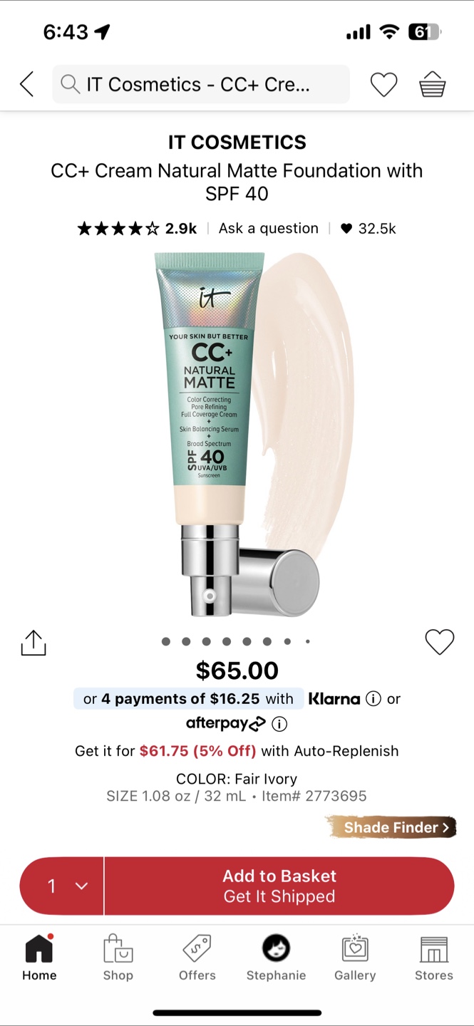 (USED ONCE) IT Cosmetics CC+ Cream Natural Matte FAIR PORCELAIN