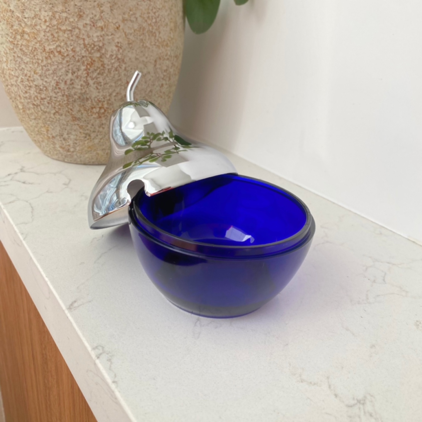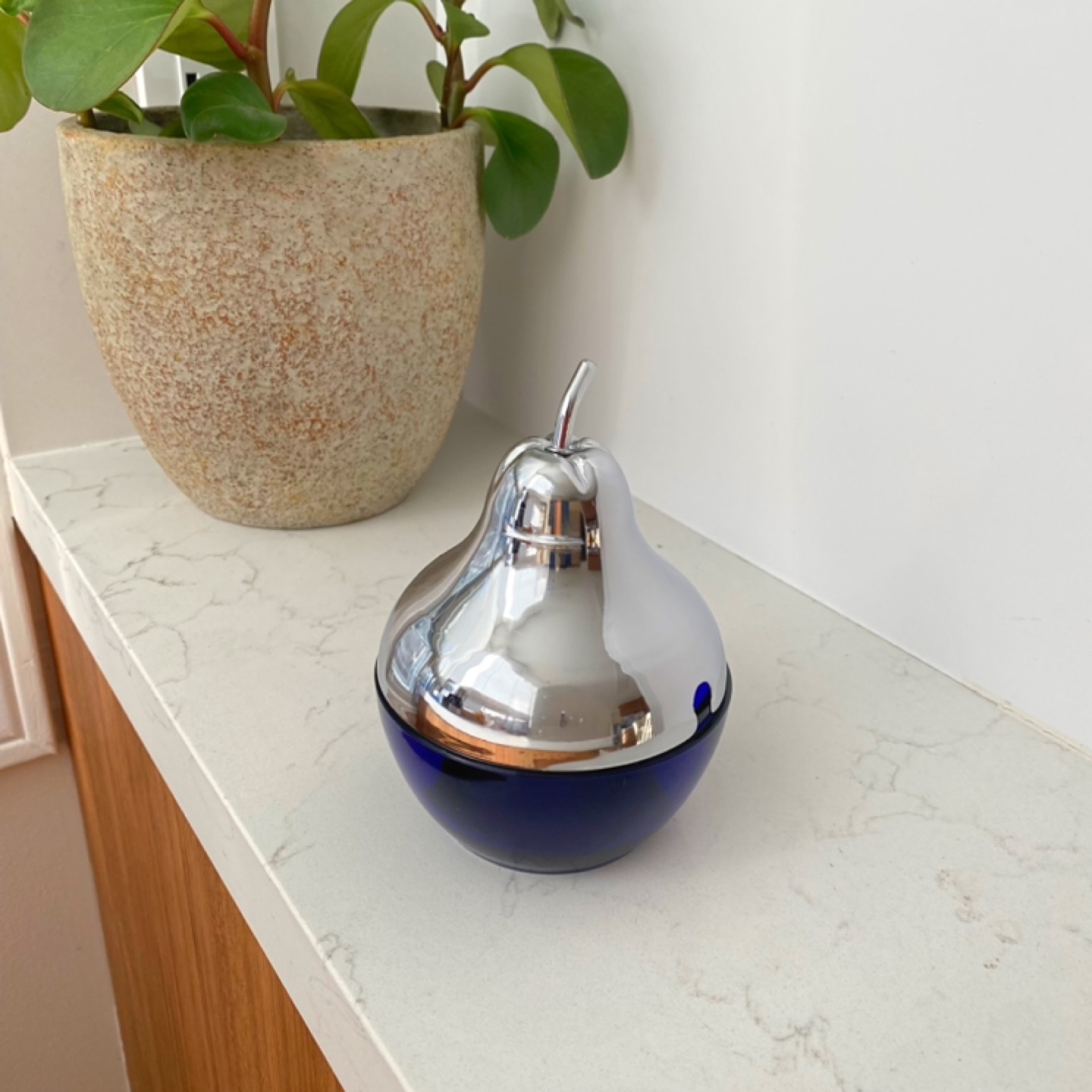 This is a lovely trinket dish featuring a silver chrome pear top and a blue glass base. It's perfect for holding small items like jewelry or keys, and adds a touch of elegance to any space!