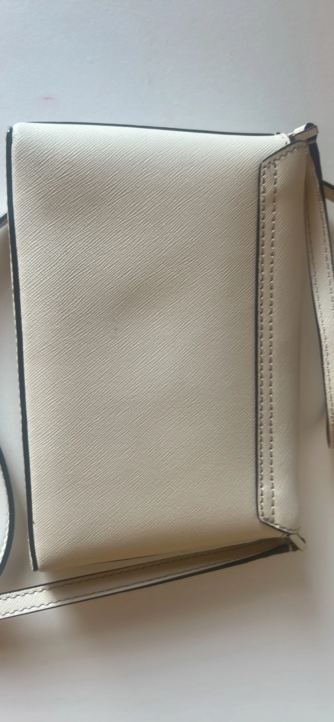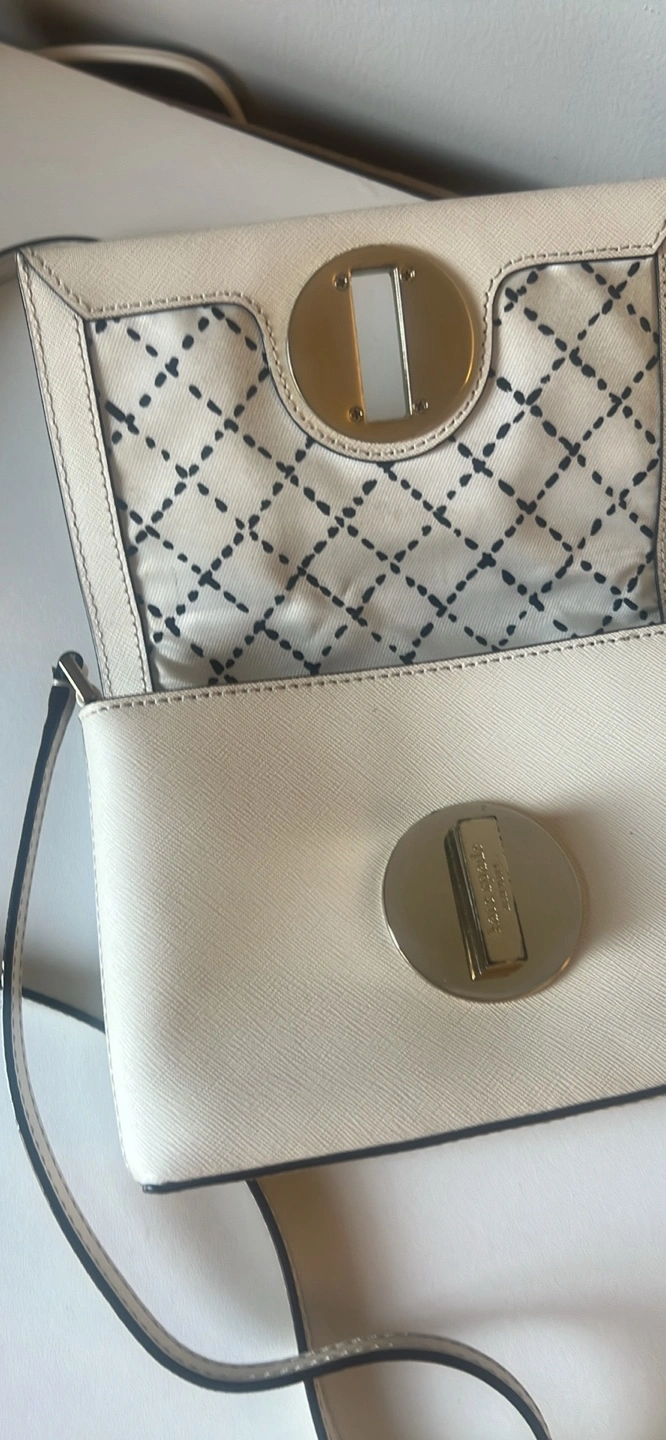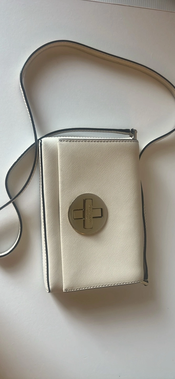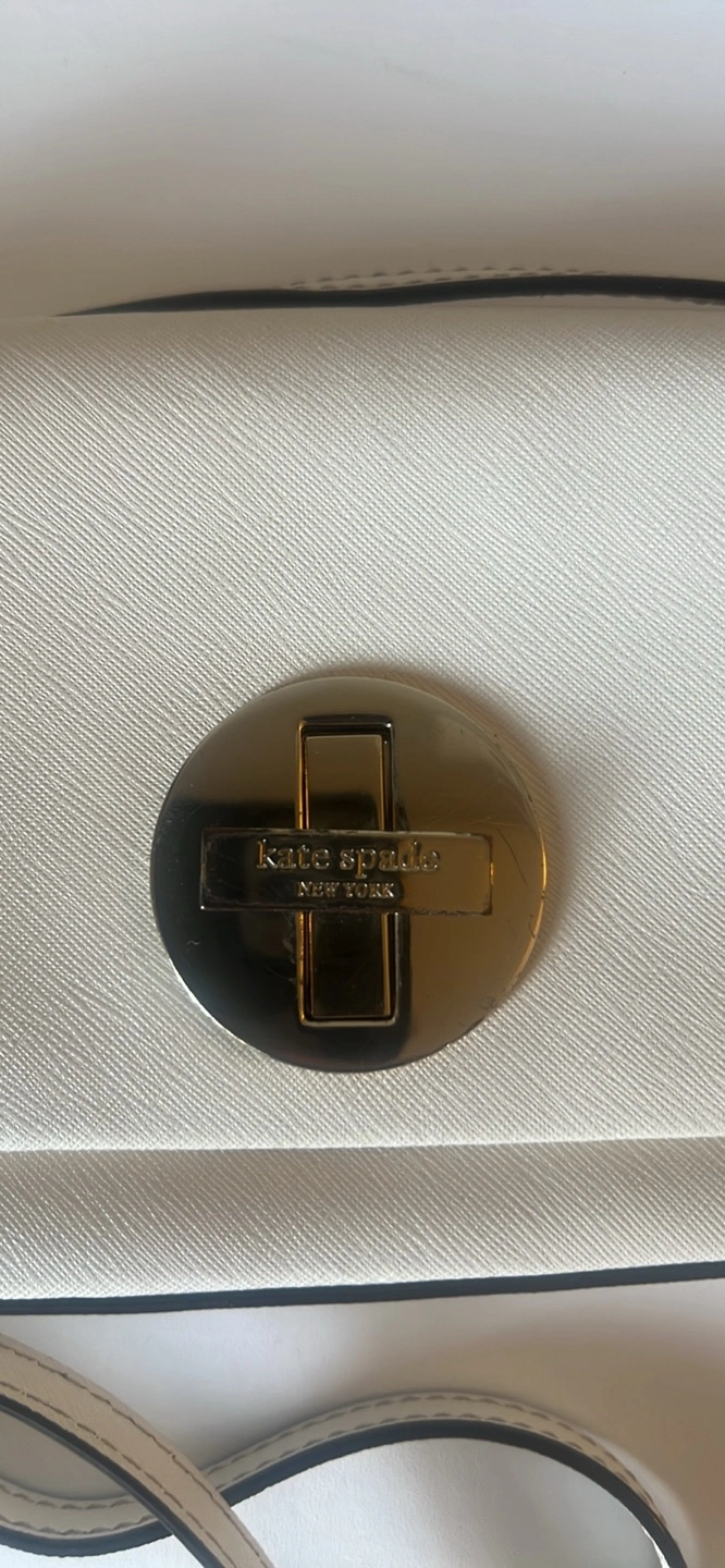 Selling a cute Kate Spade crossbody bag in a lovely white colour! It's in good condition and perfect for carrying your essentials. The bag features a unique lock design and a stylish interior pattern. Feel free to ask any questions!