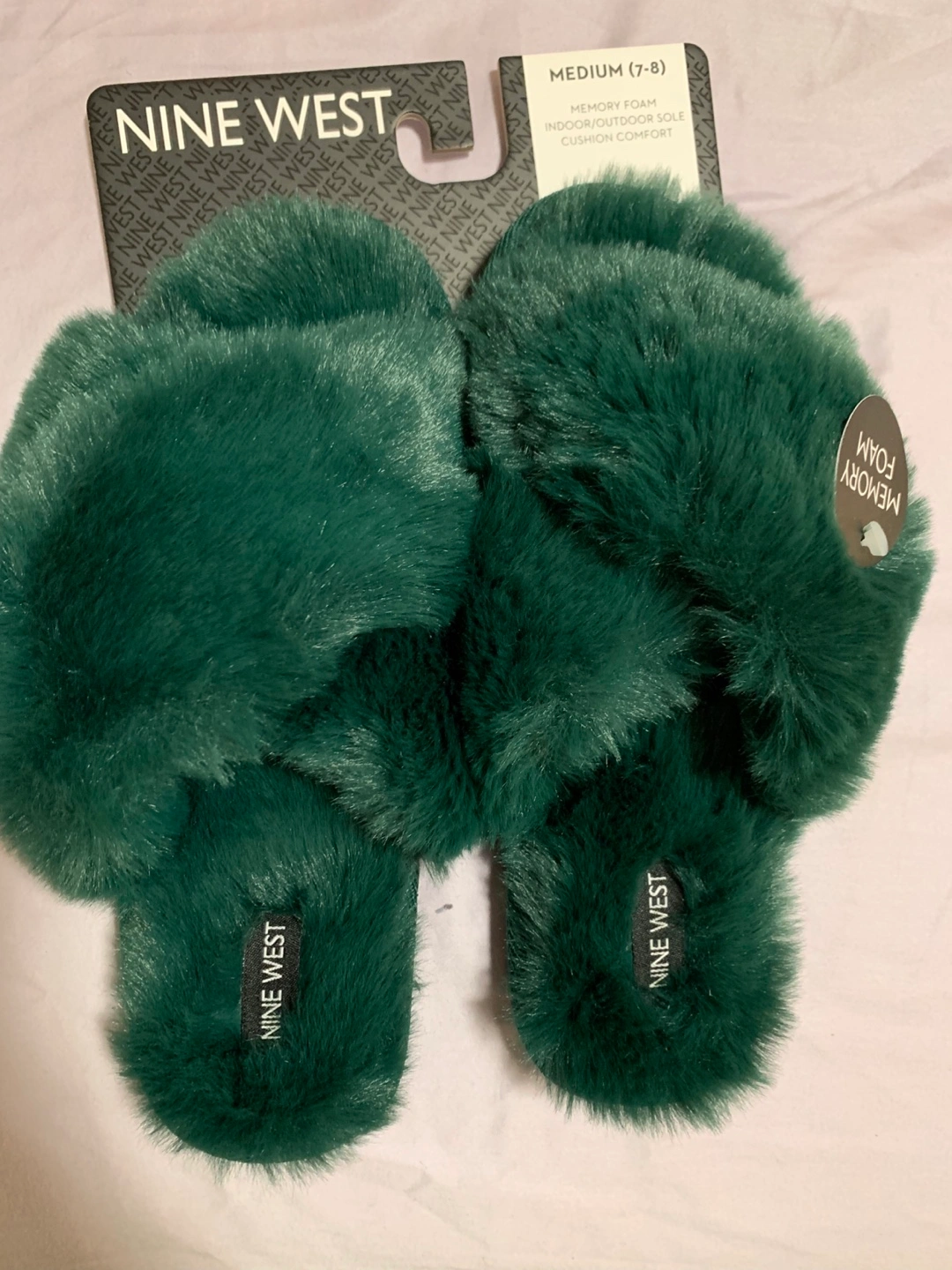 Brand new Cozy up with these Nine West faux fur slippers! They're a beautiful shade of green and feature a memory foam insole for extra comfort. Perfect for lounging around the house. Size Medium (7-8)