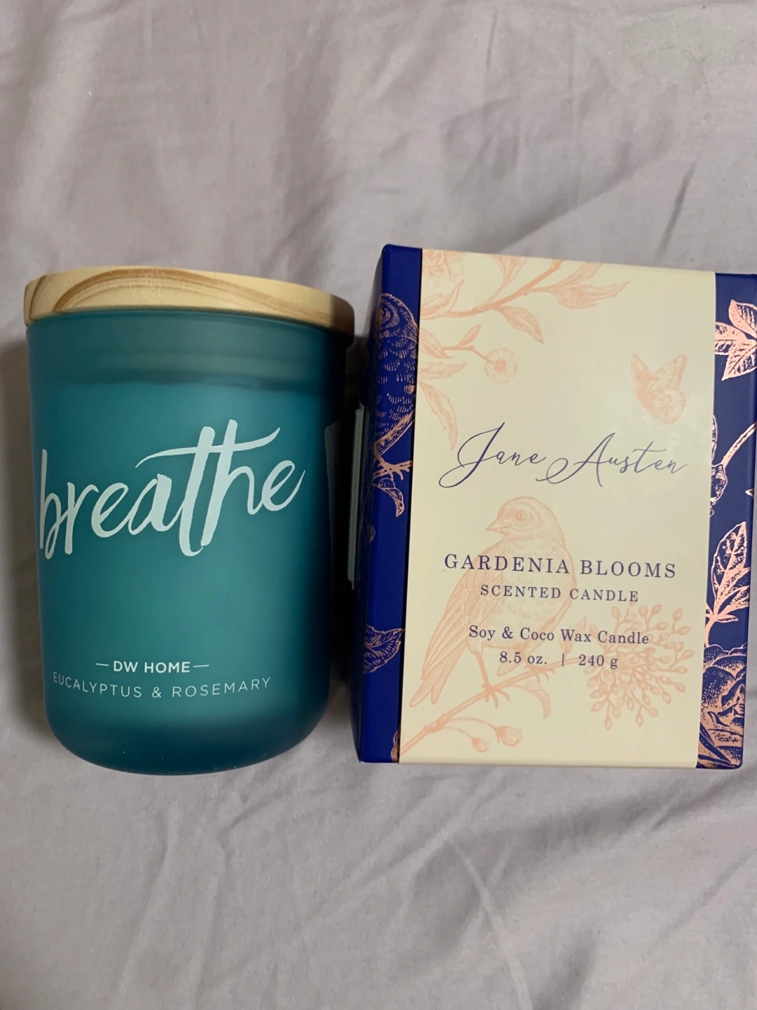 Selling a DW Home Eucalyptus & Rosemary candle and a Jane Austen Gardenia Blooms scented candle! The Gardenia Blooms candle is made with soy and coco wax, and is 8.5 oz / 240 g