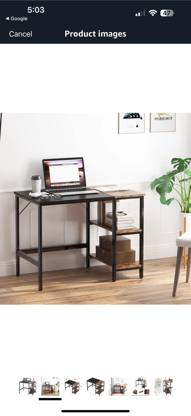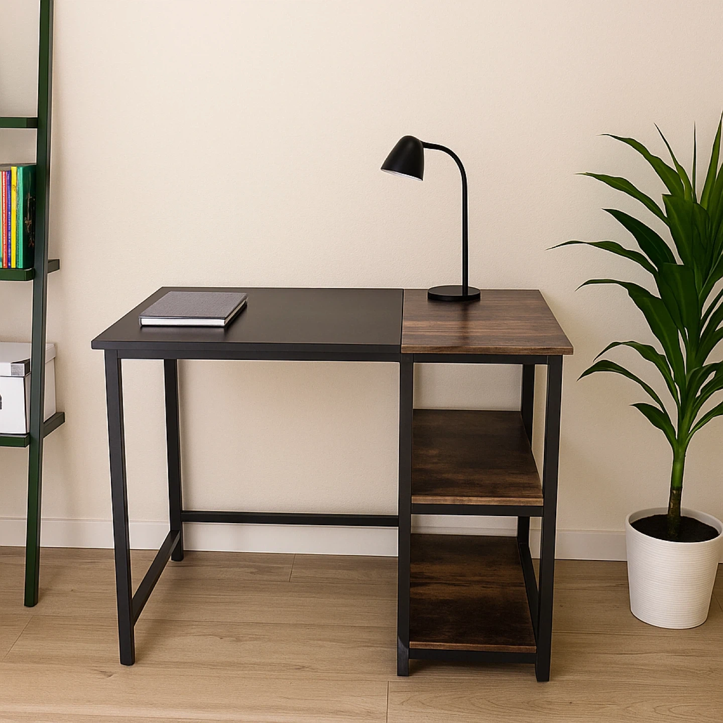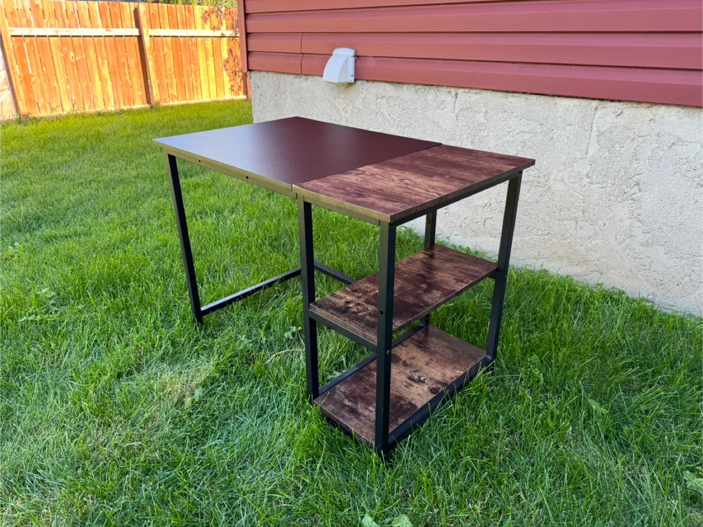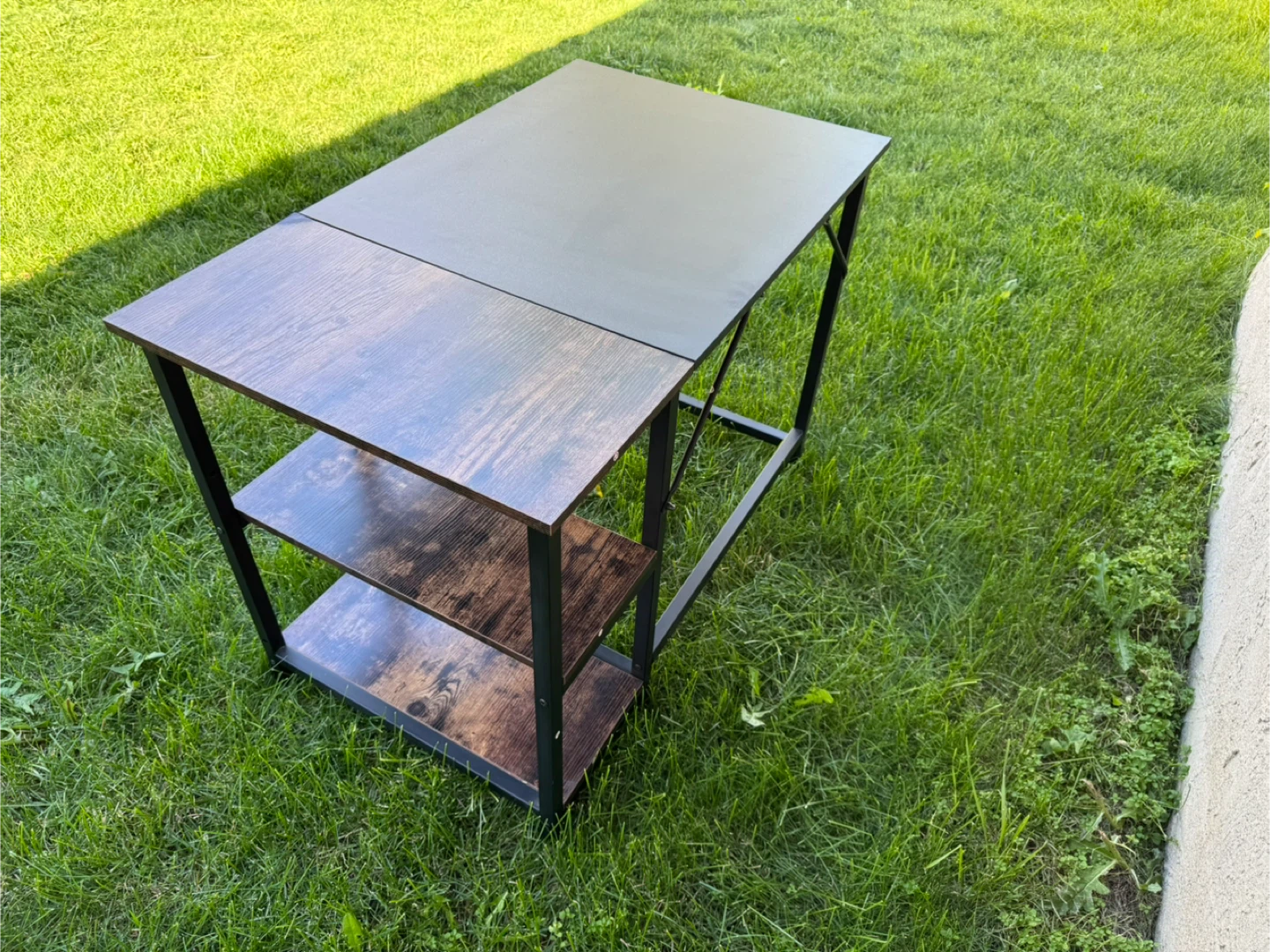 Selling a computer desk with a black metal frame and a combination of black and brown wood-look surfaces. It features shelving on one side for extra storage. Great for a home office or study space!