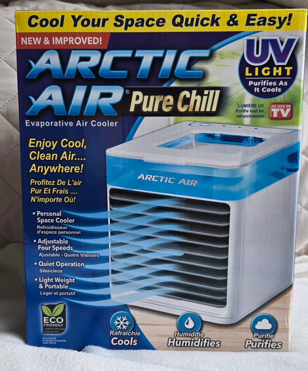 Cool your space quickly and easily with the Arctic Air Pure Chill! It's lightweight and portable, perfect for personal space cooling. Key features: - Adjustable four speeds - Quiet operation - Purifying UV light - Multi-directional air vent Includes: - Arctic Air Pure Chill - Replaceable evaporative air filter - Wall adapter - Instruction guide EUC & Box is included!
