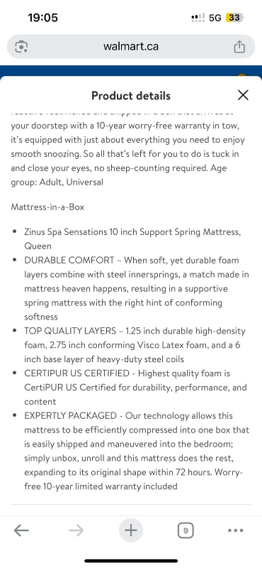 Selling a Zinus Spa Sensations 10-inch support spring mattress in queen size. It's a mattress-in-a-box, featuring durable comfort with layers of durable foam combined with steel innersprings. The top quality layers include high-density foam, conforming Visco Latex foam, and heavy-duty steel coils. It is also CERTIPUR US Certified for quality and performance!