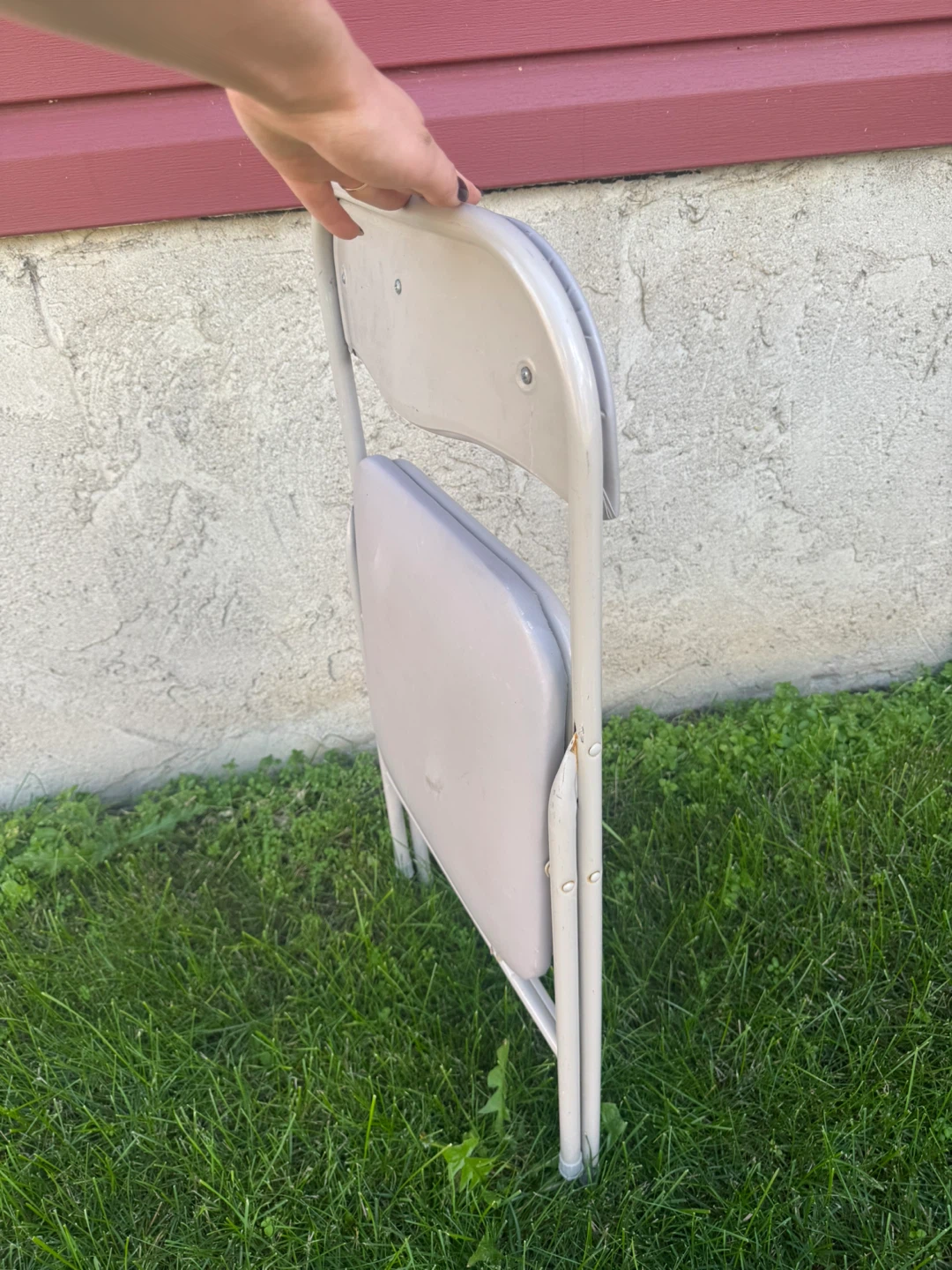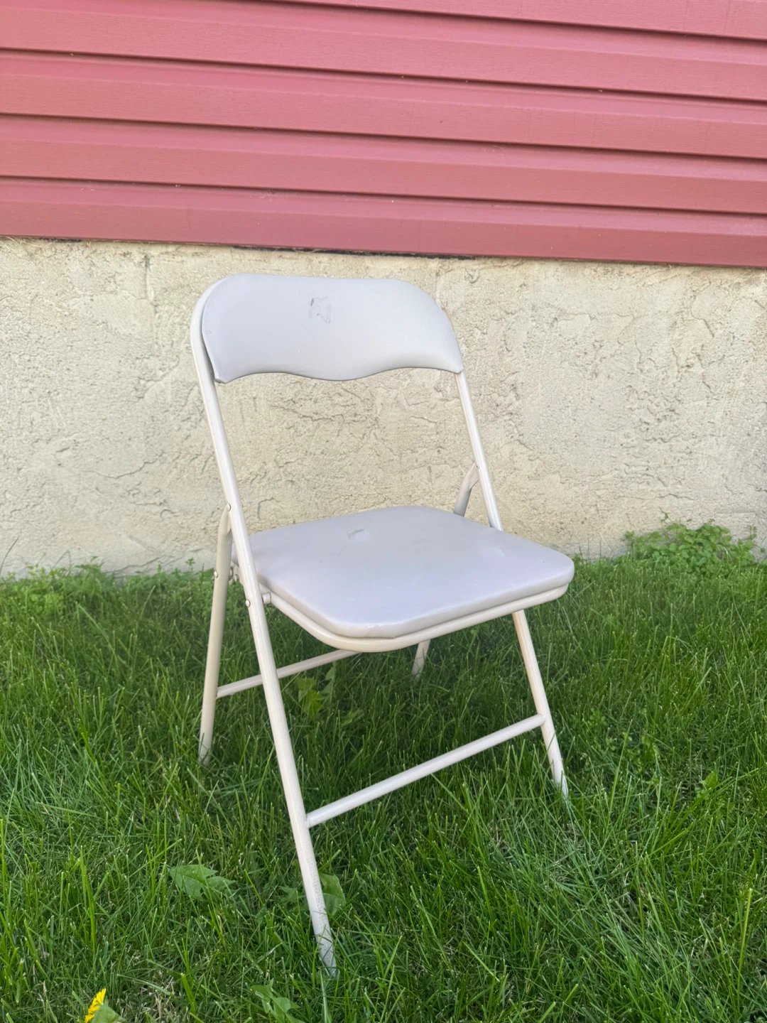 Selling a folding chair in good condition. It's lightweight and easy to store, perfect for extra seating when you have guests over. There are some minor signs of use, but it's still sturdy and functional.
