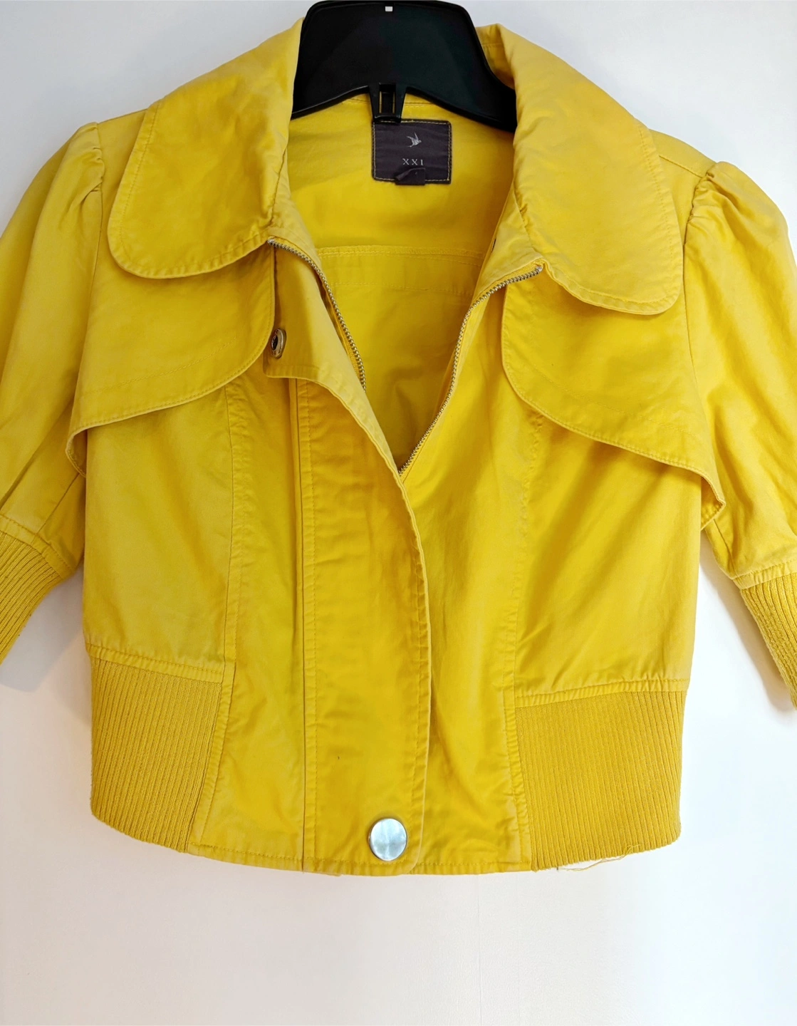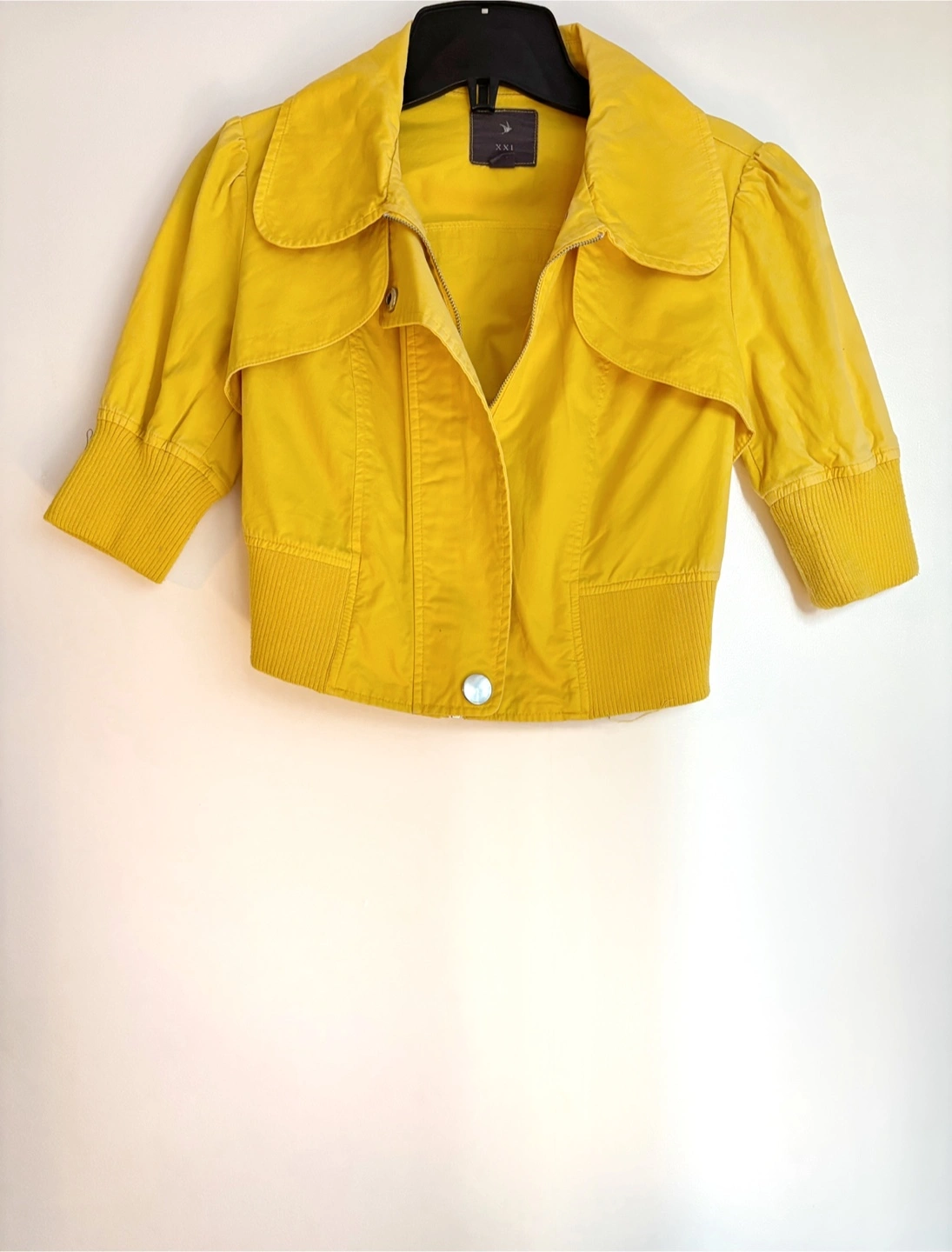 This is a yellow cropped jacket with short sleeves from Forever 21 in size S. It has a cool collar and a button closure. Perfect for adding a pop of colour to your wardrobe!