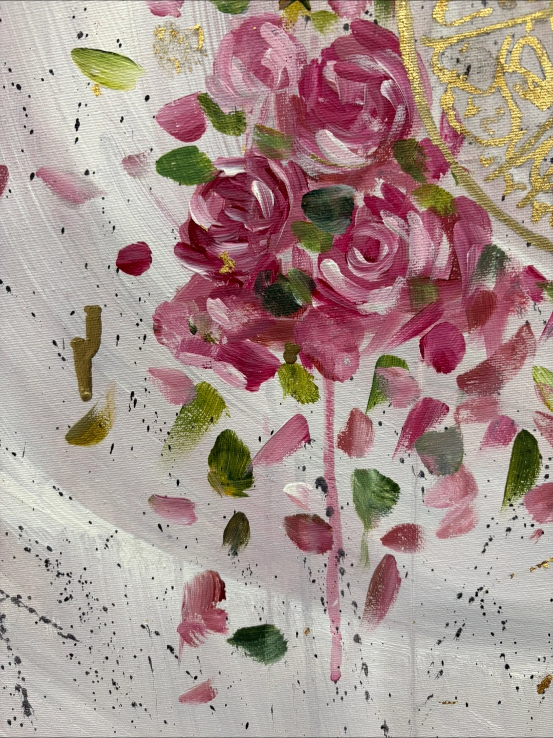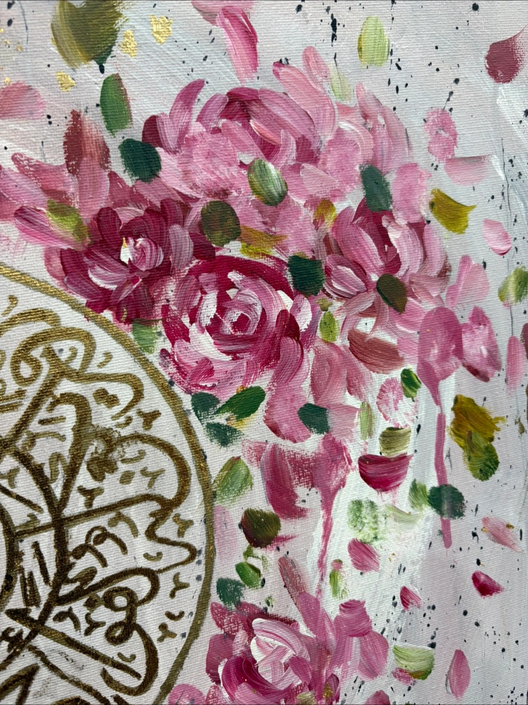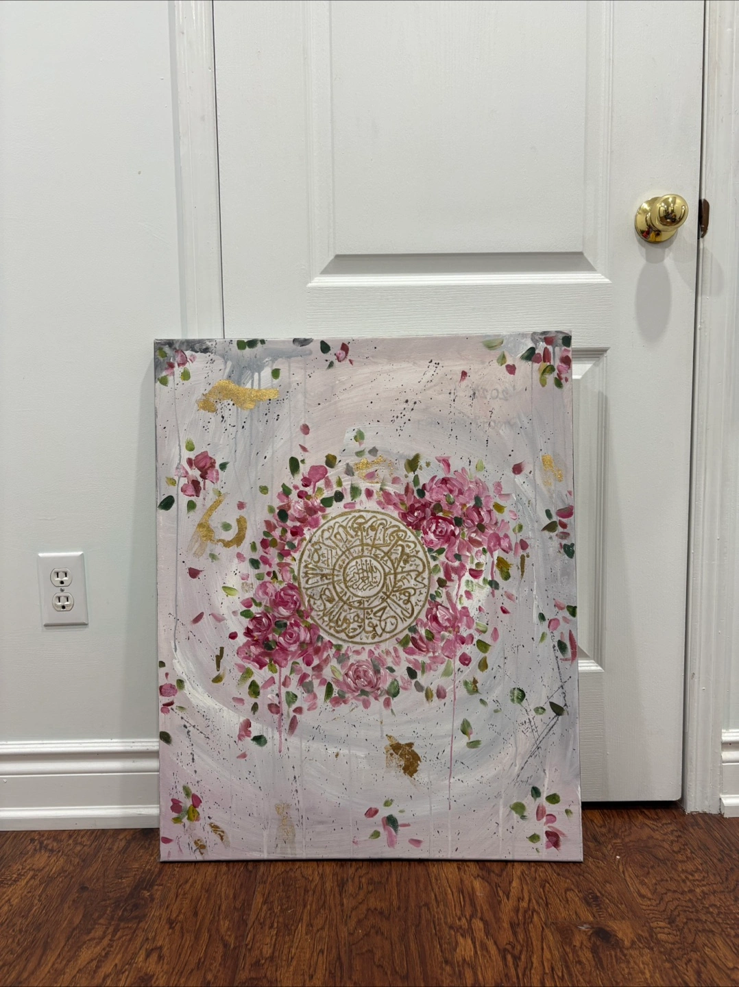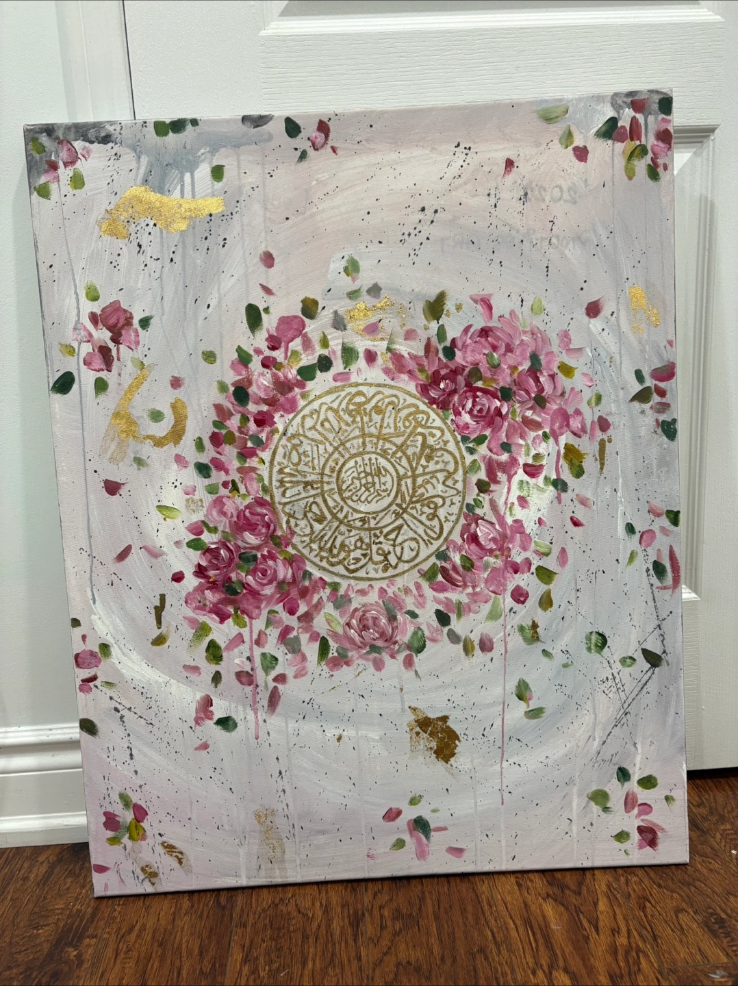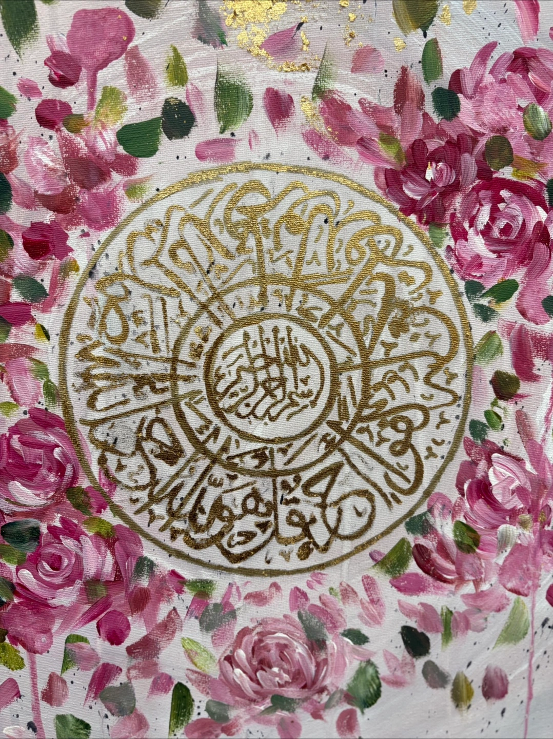 A hand painted pink and gold leaf floral piece with Surah Ikhlaas in the centre. Bring blessings to any room! Arabic Calligraphy