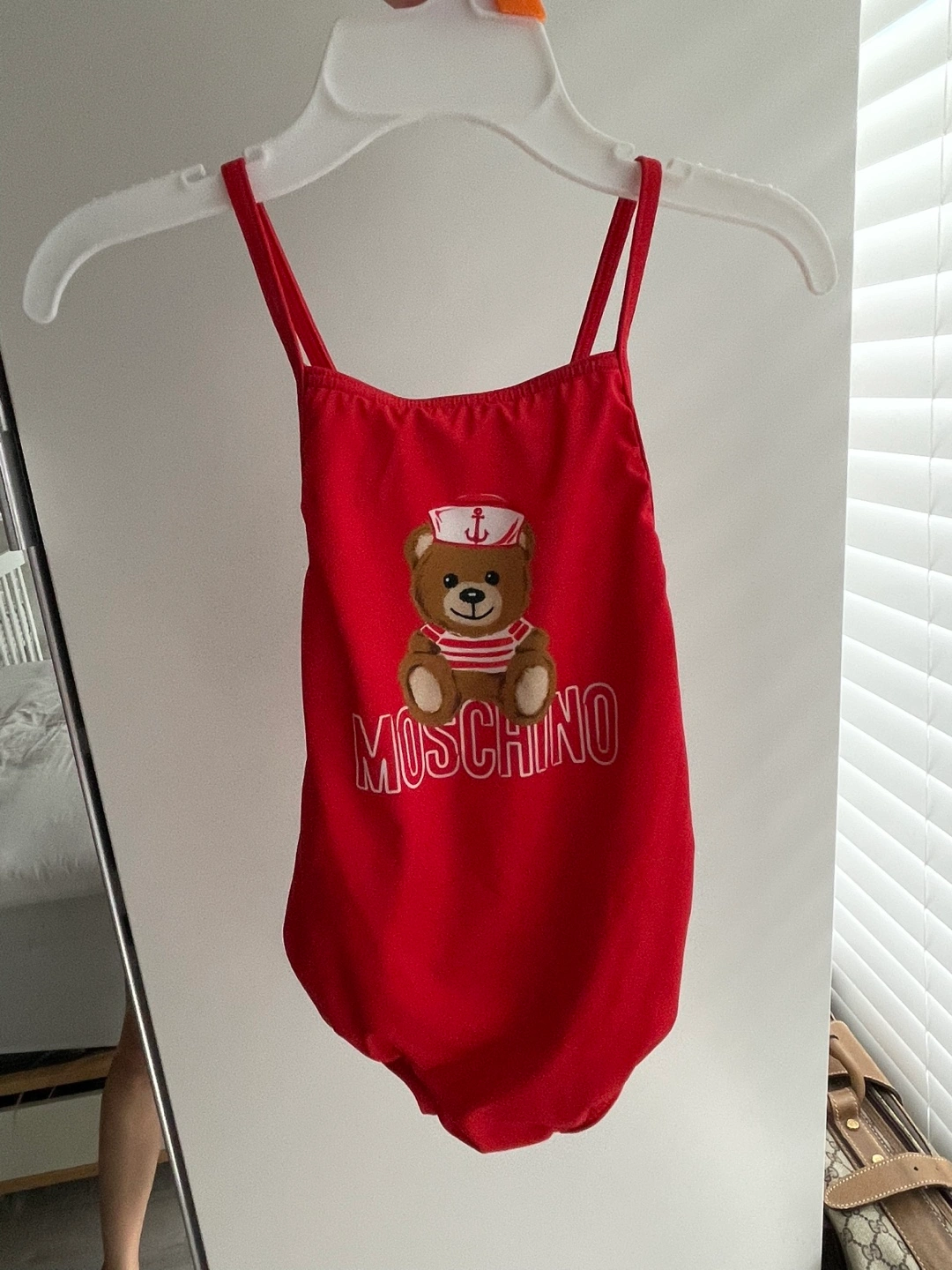 Adorable Moschino Baby red swimsuit, perfect for your little one! It's in great condition and features the signature Moschino teddy bear design. Size is 18-24 months.