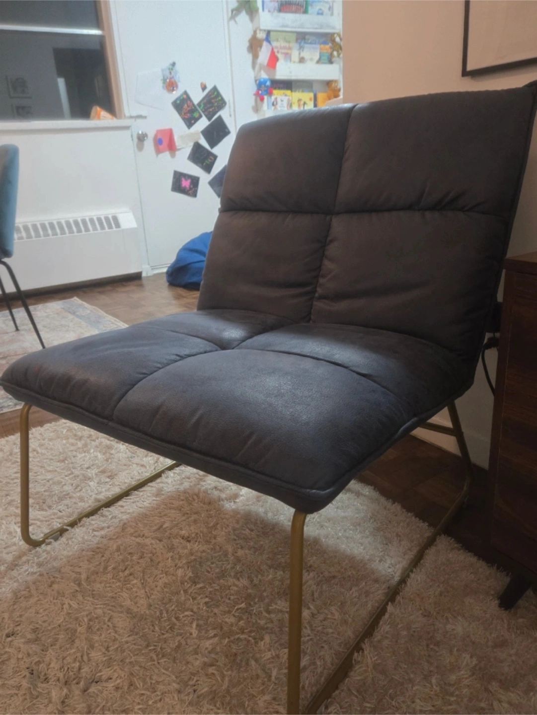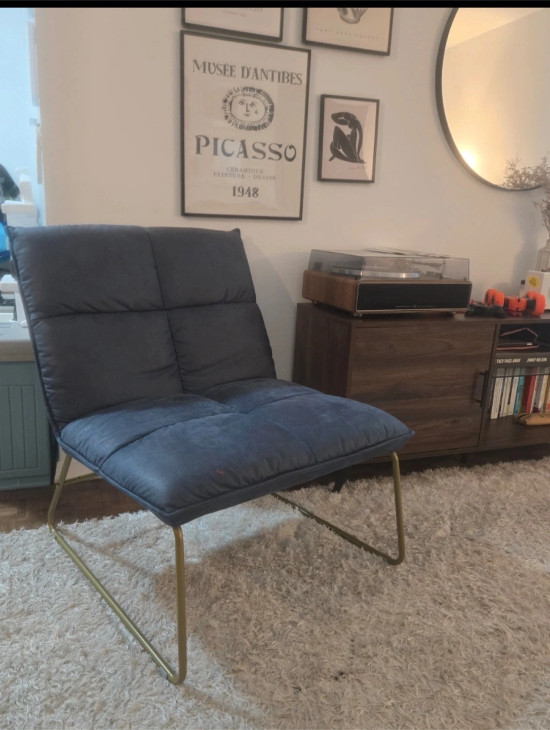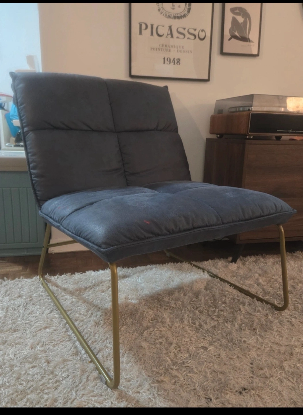 1000+Looking to sell this modern accent chair! It's a stylish addition to any room, with a comfortable padded seat and back. The chair features a sleek design with metal legs. The colour is a nice blue-grey, and it's in great shape. Perfect for a reading nook or living room seating