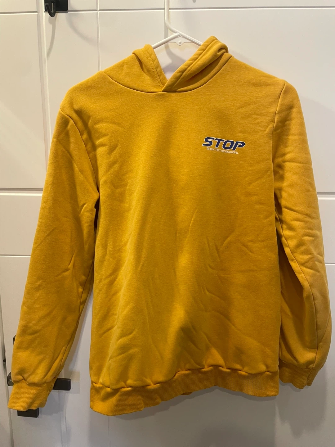 71A comfy yellow hoodie with 'STOP Sports the Original' printed on the front. It's in great condition and ready for a new home!