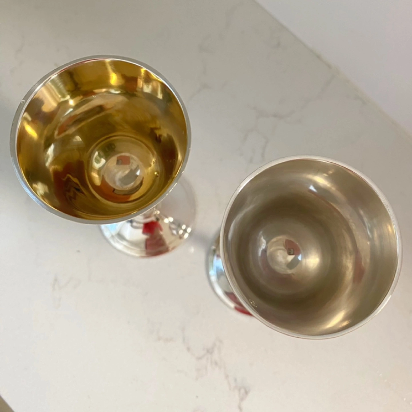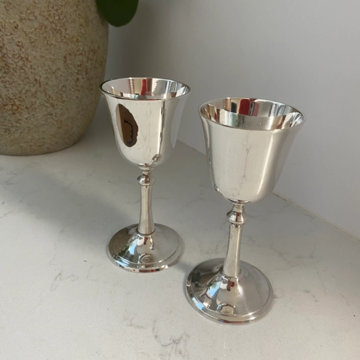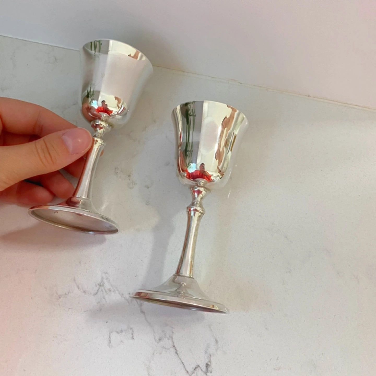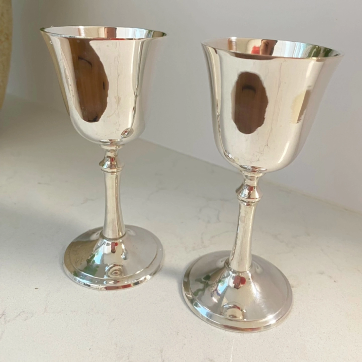 Here's a set of two elegant silver wine goblets. They'd make a lovely addition to any home bar or special occasion. They have a beautiful shine and classic design!