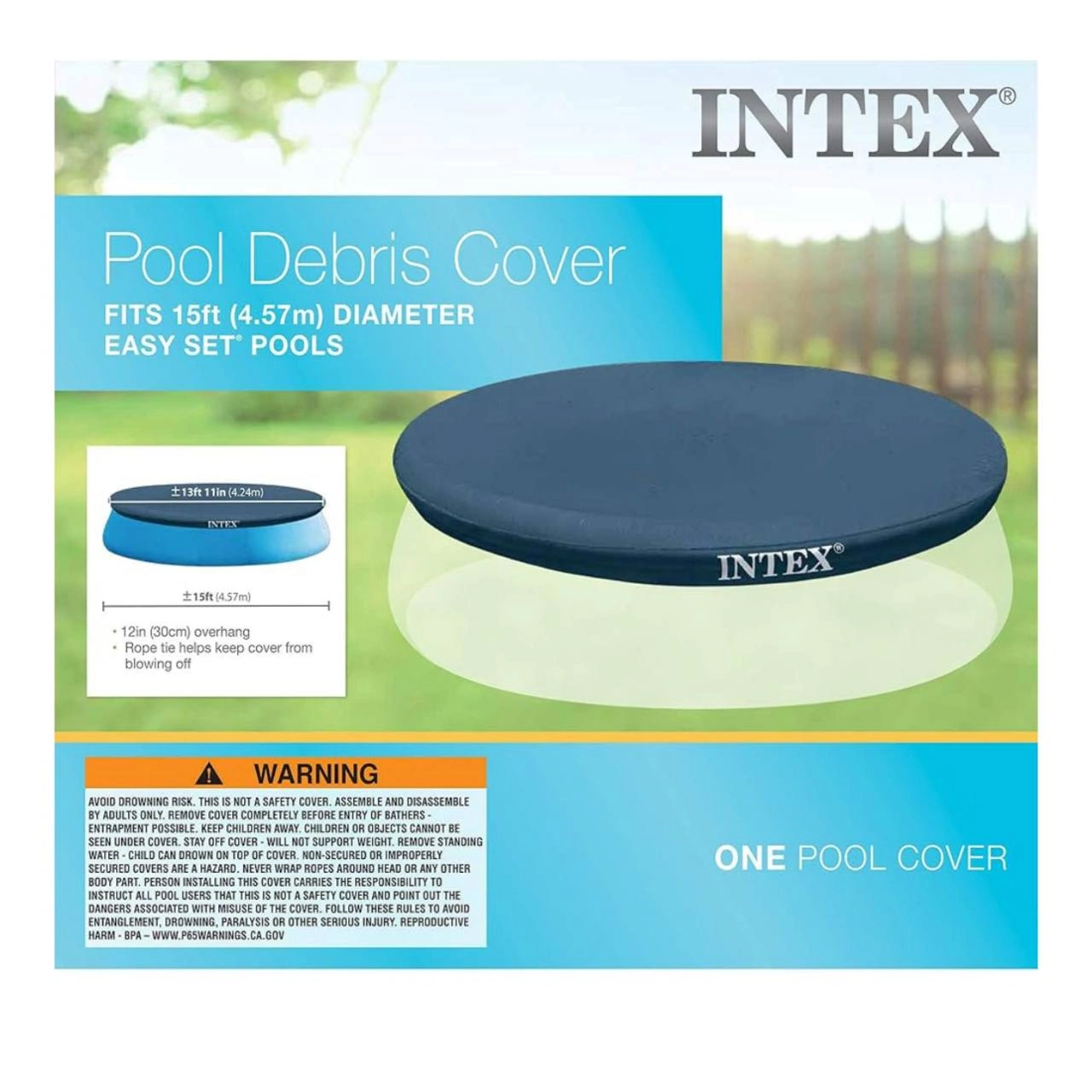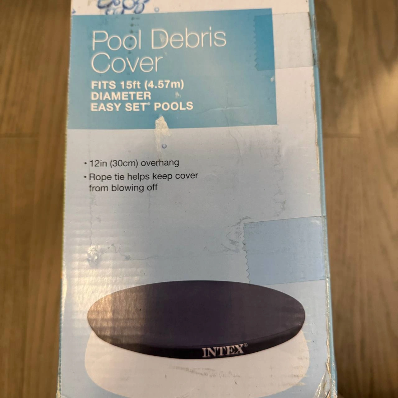 15-foot round easy set pool cover with rope tie and drain holes. Keeps your pool clean and protected. Brand new, never used. Pickup in Oakville