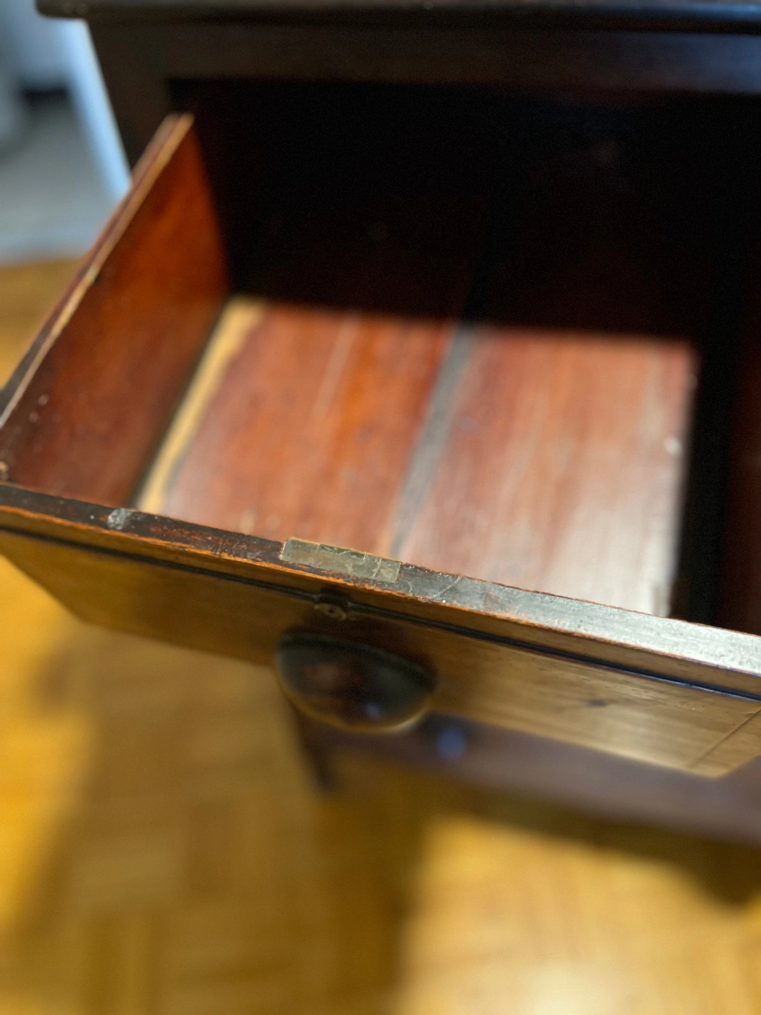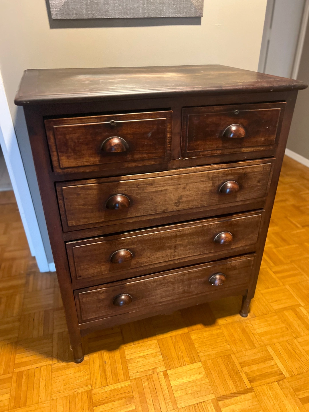 Antique solid wood dresser with 5 drawers. Sturdy and full of vintage charm. Some drawers are not perfectly smooth but still functional. Great storage piece for bedroom, entryway, or living room.