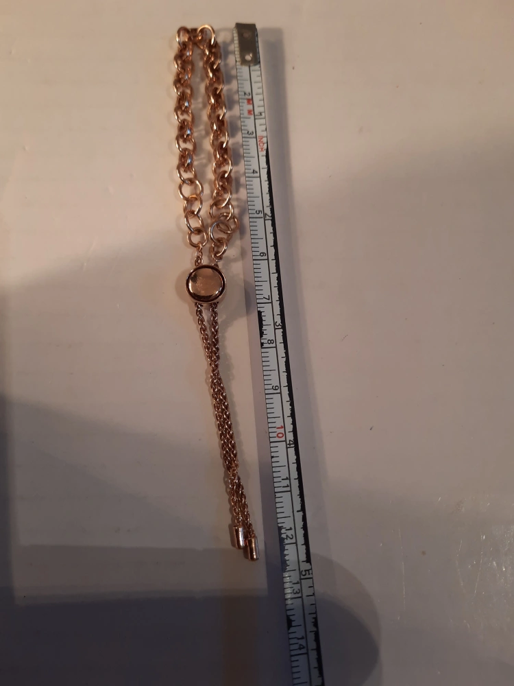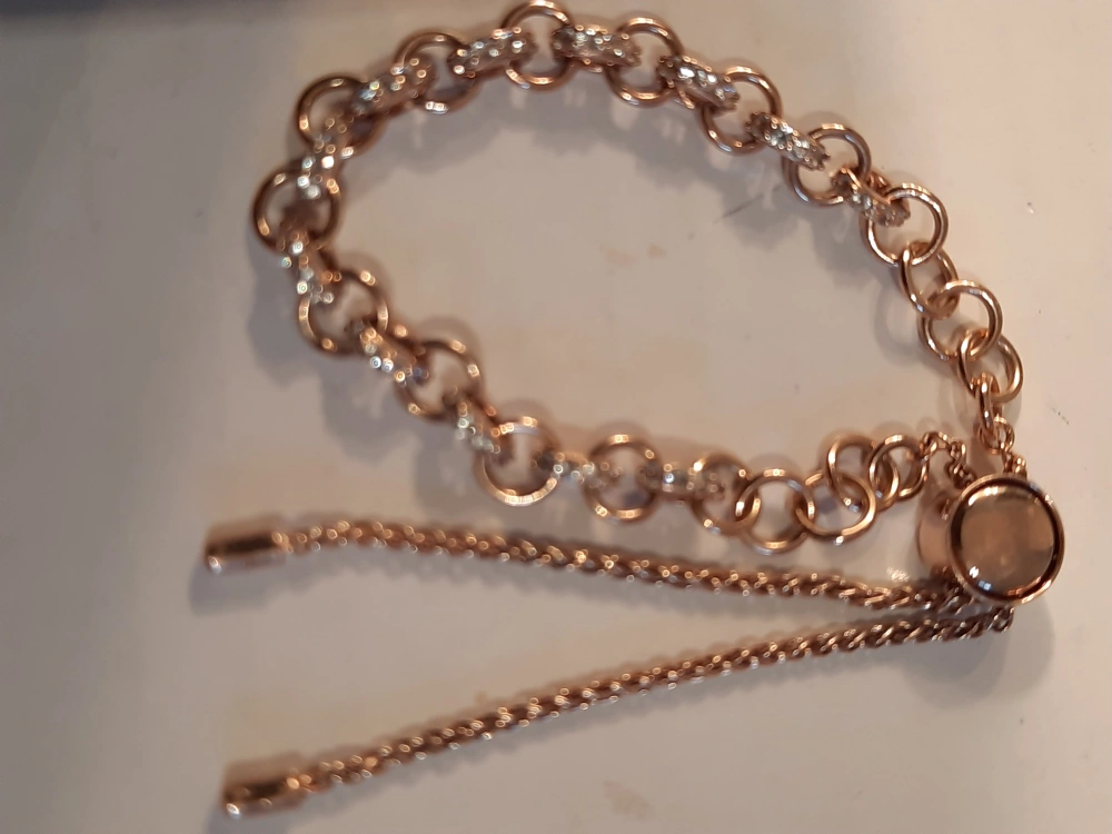 Selling a lovely18k rose gold on 925 silver bracelet! It features a chain link design with small rhinestones set in some of the links. The bracelet has a unique adjustable clasp with two dangling chains. It appears to be made from 925 silver and 18K gold.fit anyone adjustable ,good condition. like new.pick up in oshawa
