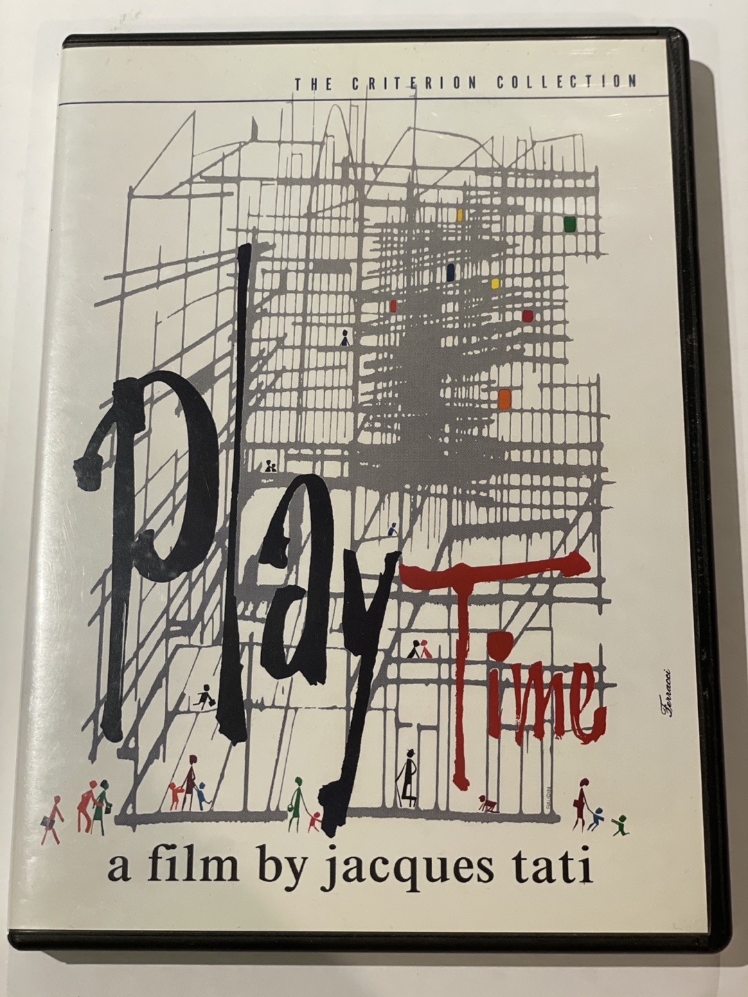 Selling a DVD of "Playtime", a film by Jacques Tati. This is part of The Criterion Collection. It includes special features such as a spectacular digital transfer with restored image and sound, and a video introduction by writer, director, and performer Terry Jones. The film is in French with optional English subtitles.