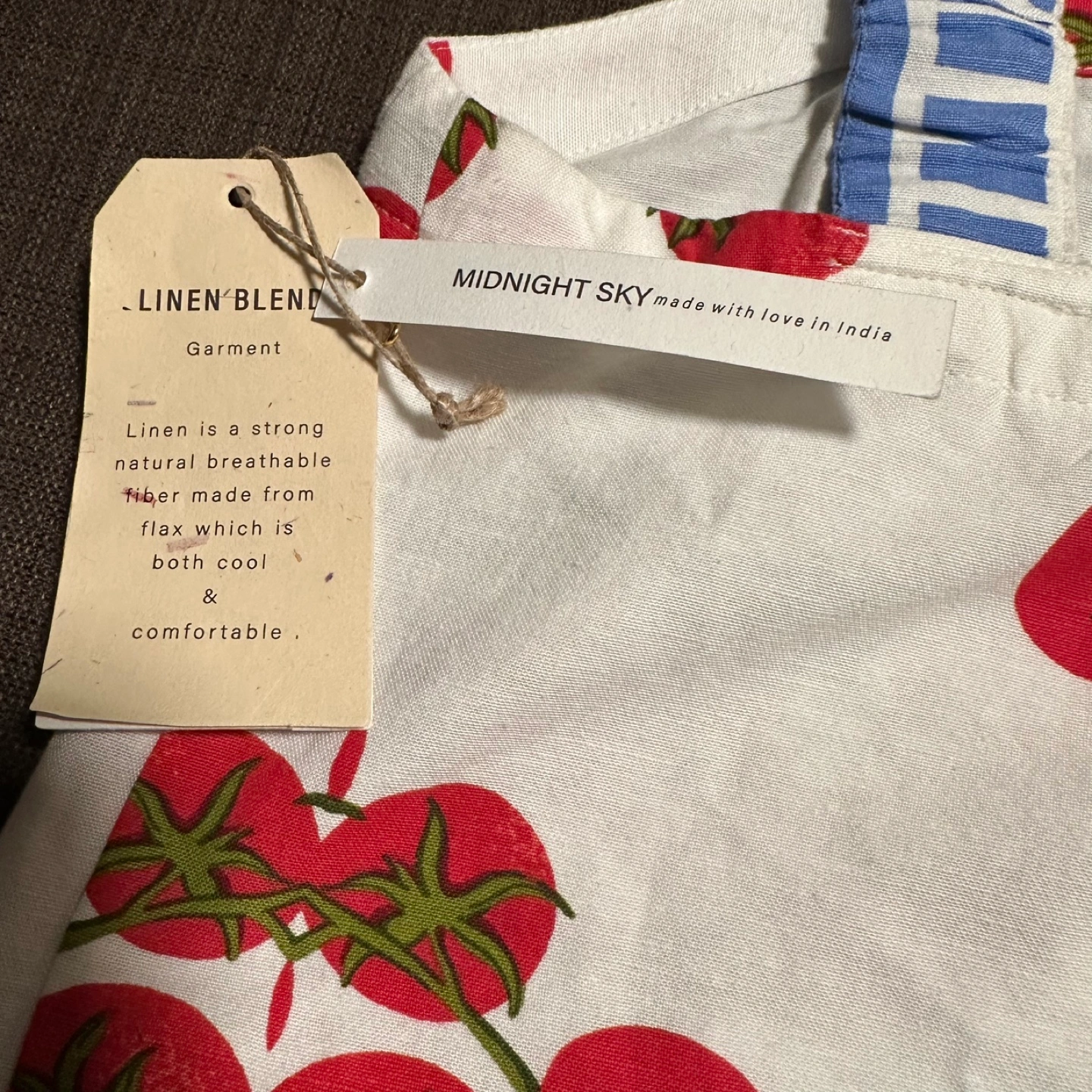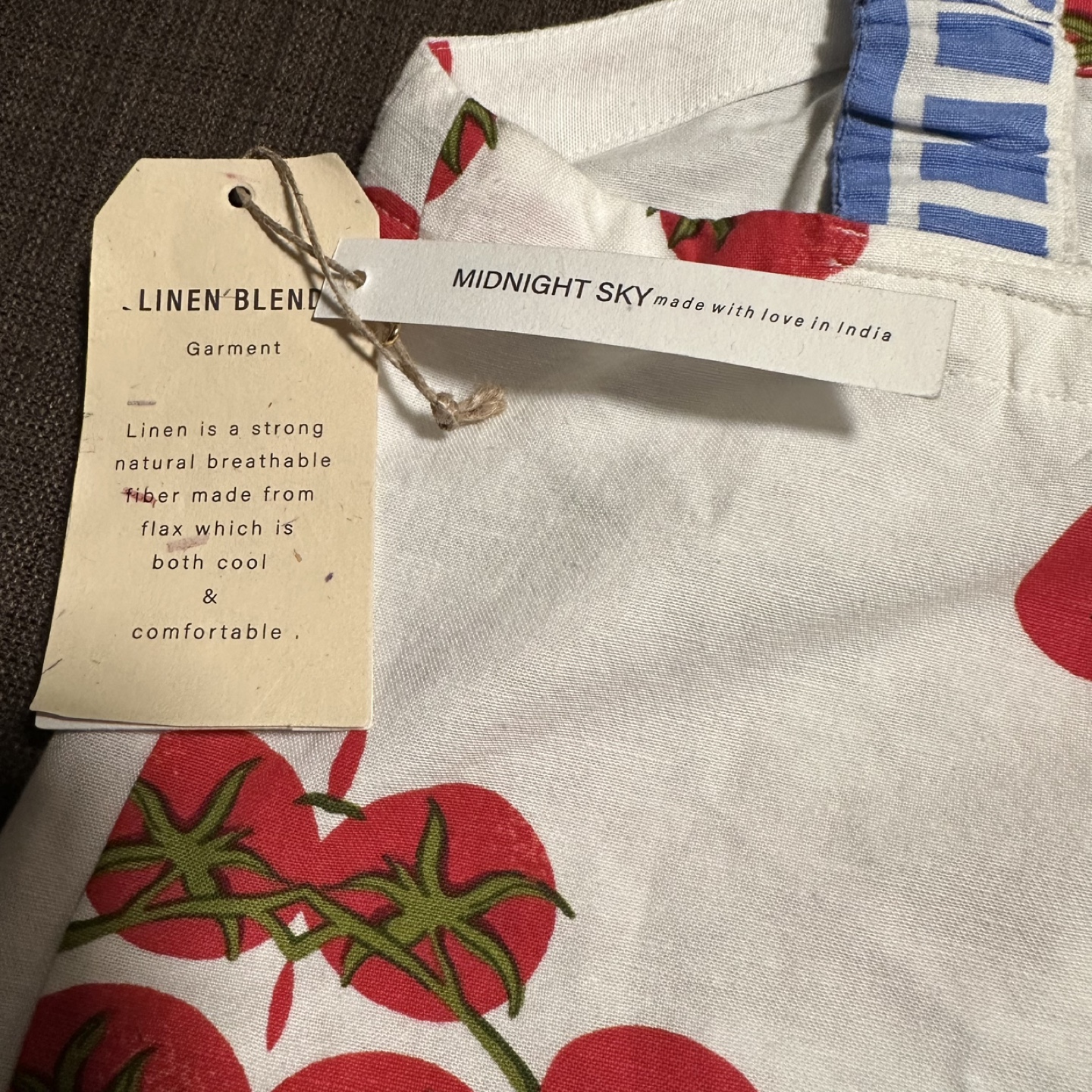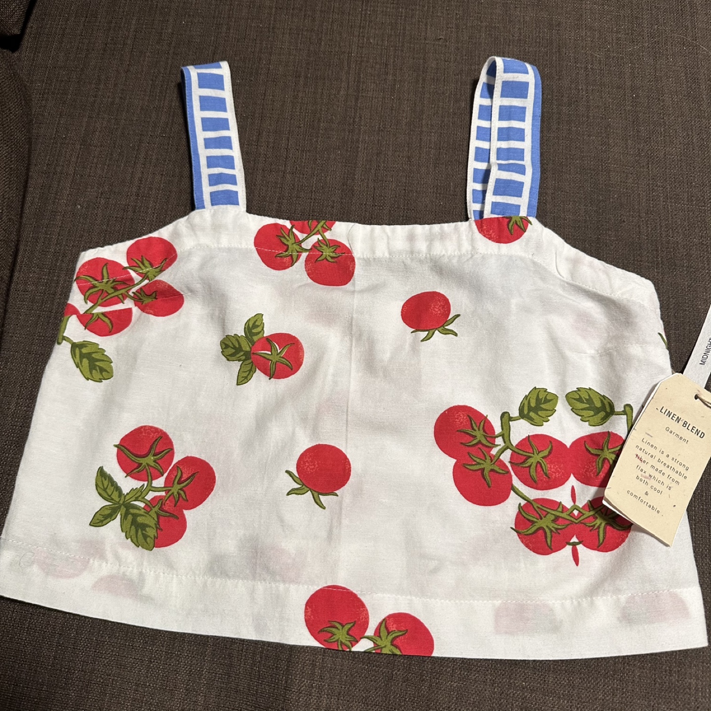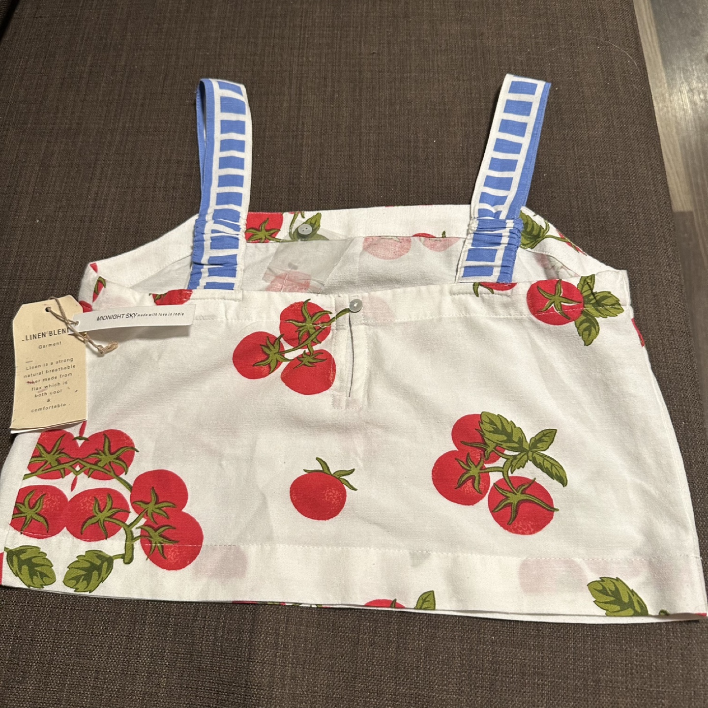 New with tags. This cute tank top from Midnight Sky features a fun tomato print! It's made with a linen blend, making it a strong, natural, and breathable garment that's both cool and comfortable. Perfect for summer!